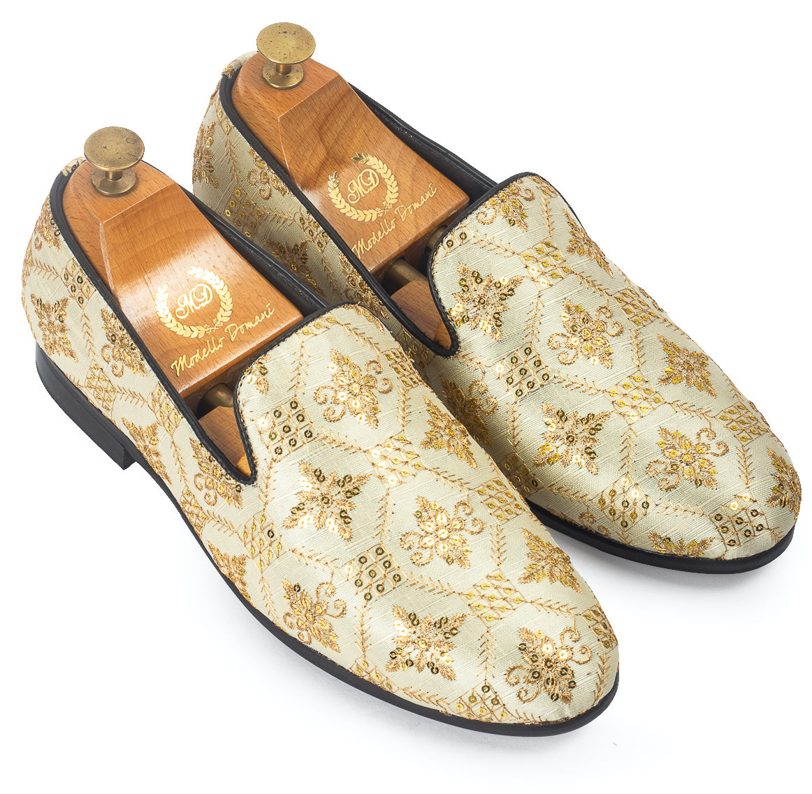 The Beige Zafrani Slip-Ons blend earthy sophistication with artisanal finesse. Designed in a soothing neutral palette, they feature subtle embroidery that nods to timeless zardozi craftsmanship. These versatile slip-ons pair beautifully with festive ensembles and everyday elegance alike. Lightweight and comfortable, they carry tradition with modern grace. A refined essential for effortless dressing.