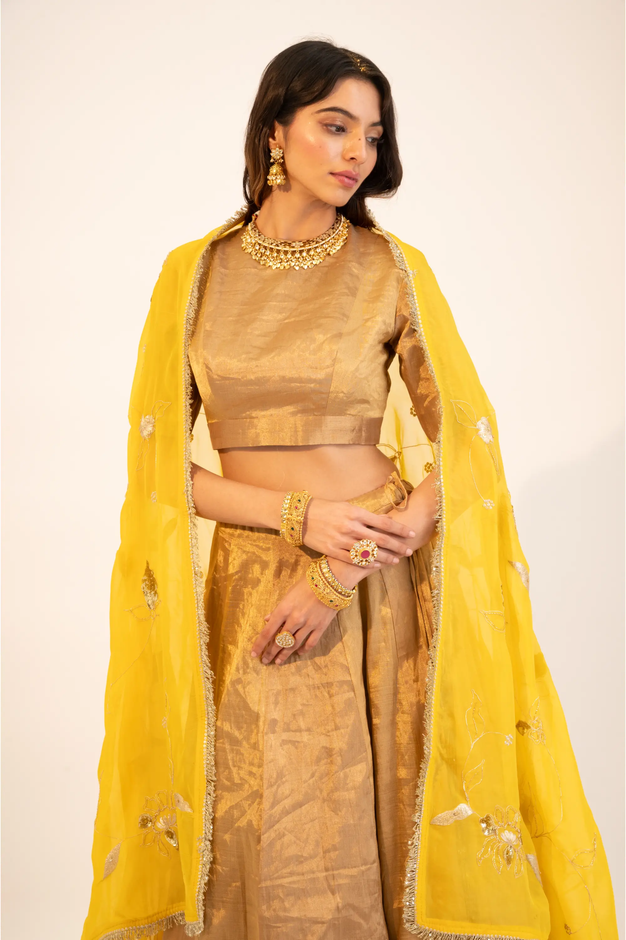 Beige zari tissue gold lehenga & blouse paired with yellow dupatta