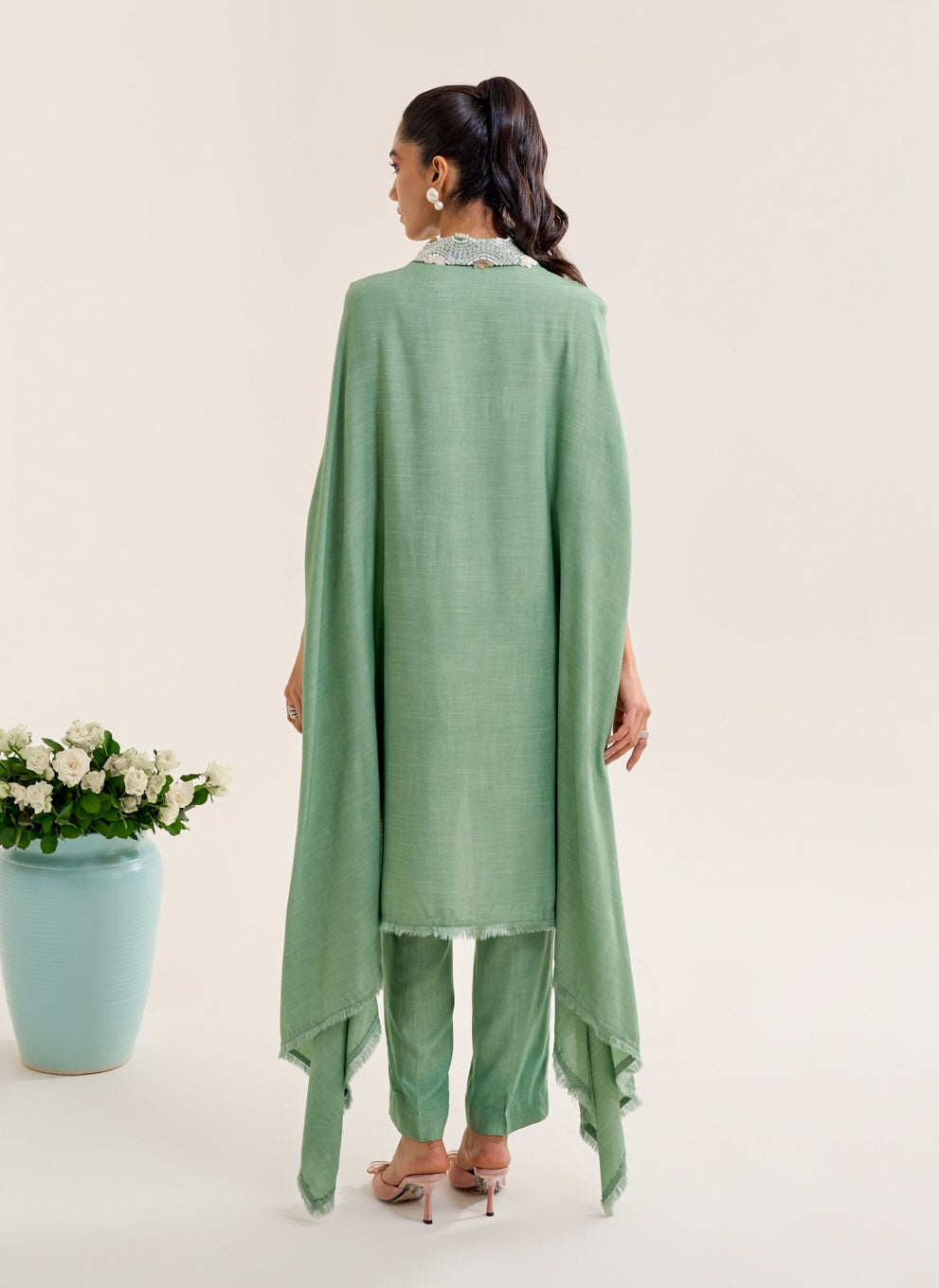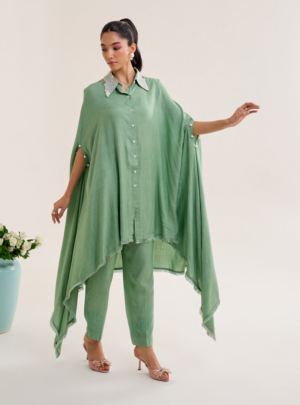 Elevate your fashion game with our asymmetric button-down kurta, featuring a beautifully hand-embellished collar that adds a touch of intricate elegance. This contemporary kurta is complemented by matching pants, offering a cohesive and sophisticated look. Perfect for special occasions or formal events, this ensemble blends modern design with artisanal craftsmanship to create a striking and refined outfit. Embrace effortless style and timeless sophistication with this chic and elegant set.