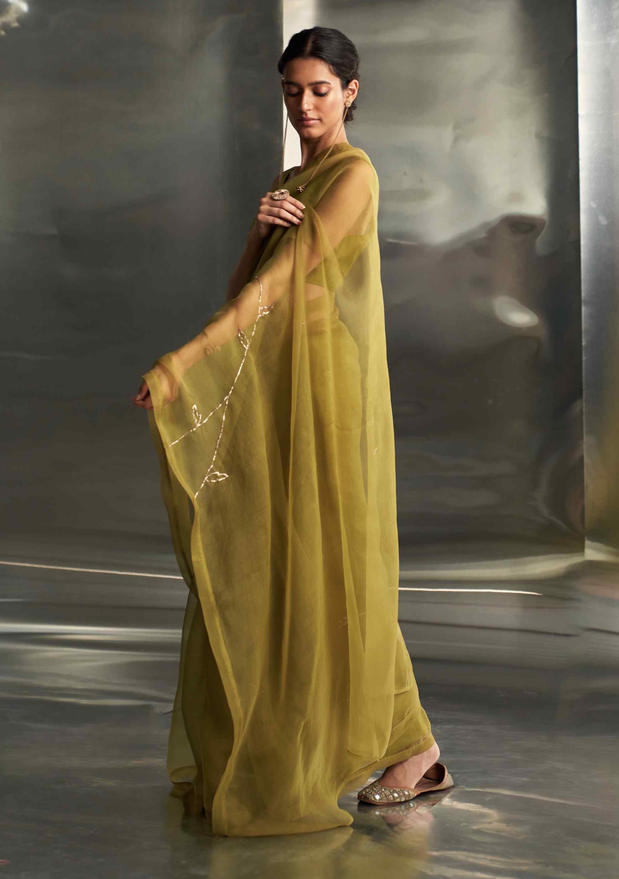 This vibrant berry green saree, crafted from luxurious pure organza, features intricate golden nakshi hand embroidery with graceful leaf motifs. The ensemble is complemented by a deep-neck, sleeveless Chanderi blouse with padding, adding a touch of glamour. Together, these elements create a look that embodies timeless elegance and sophistication.