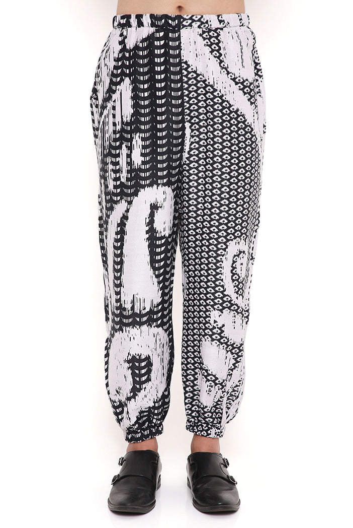 Make a statement with this black and white uzbek print dupion silk pathani kurta. The striking print adds a contemporary flair, while the luxurious dupion silk fabric ensures both comfort and elegance.