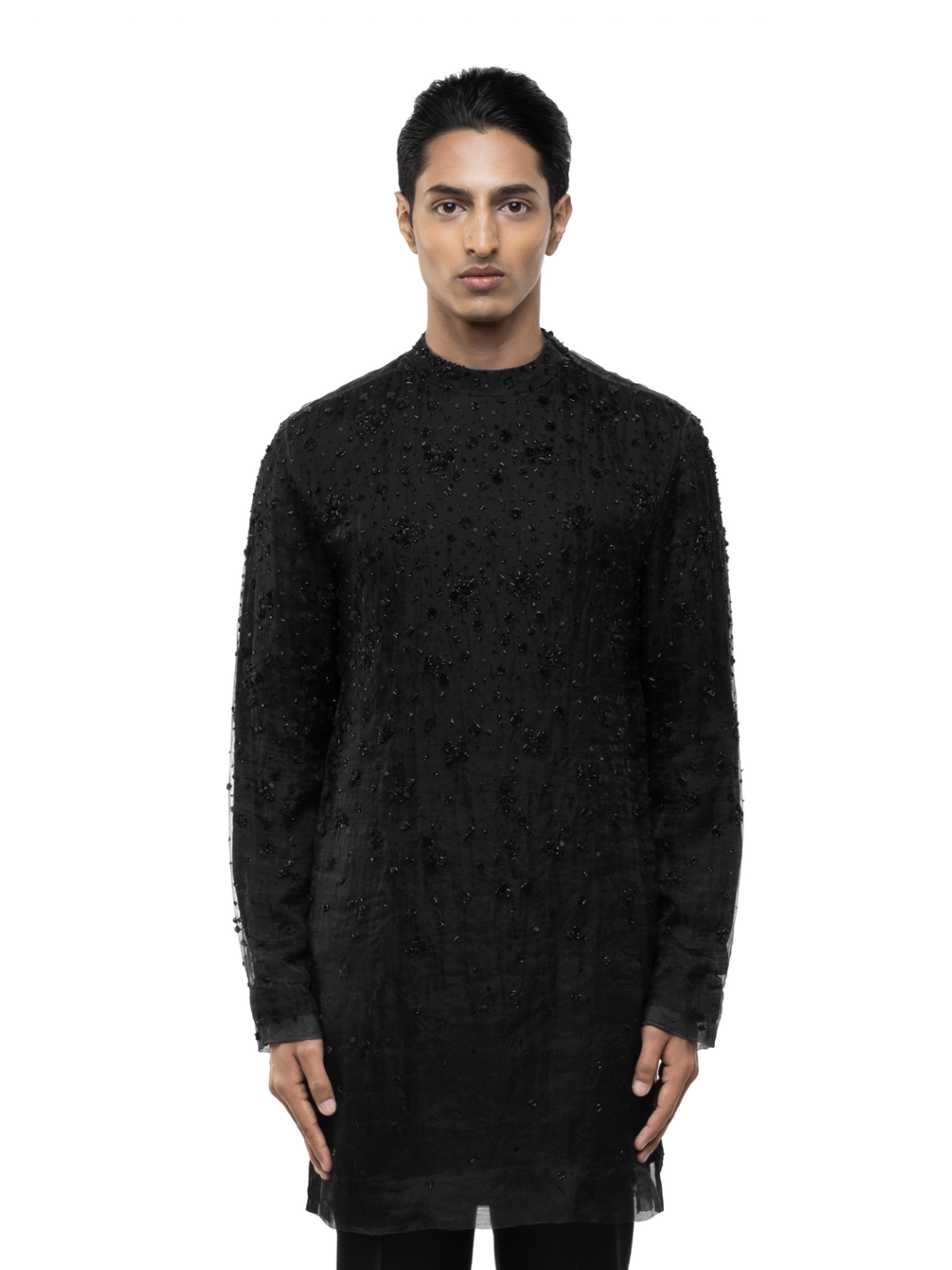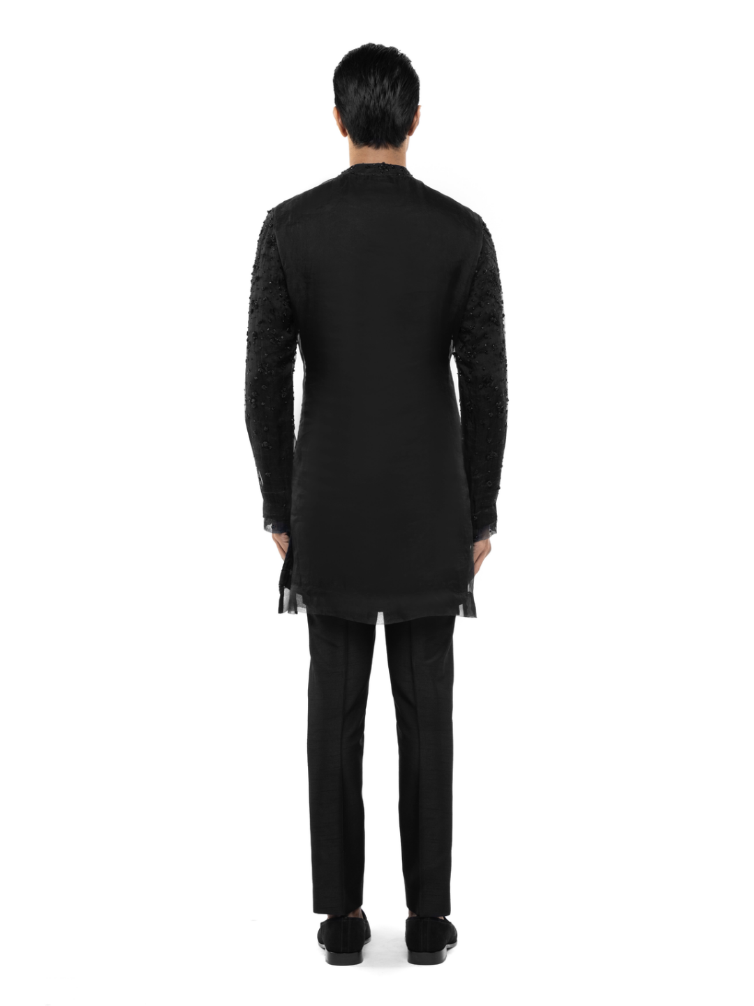 Black Organza Applique Embroidered Kurta Set. This elegant kurta set is crafted from luxurious silk with sheer organza applique embroidery, creating a striking contrast. Featuring a stand collar, no placket design, and Mother of Pearl buttons, it has a straight hem and a regular fit for a sleek and refined silhouette. Ideal for contemporary festive and formal occasions.