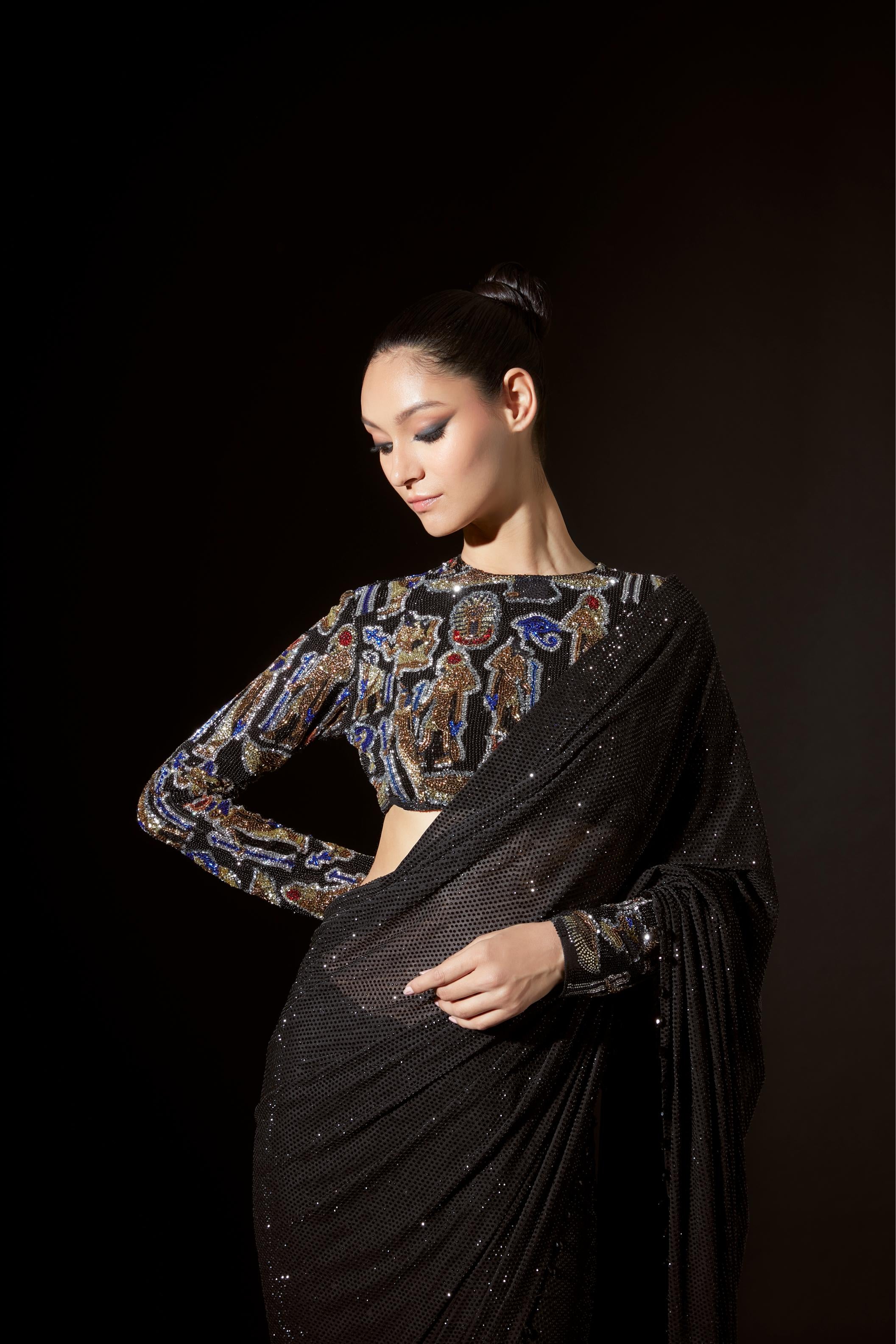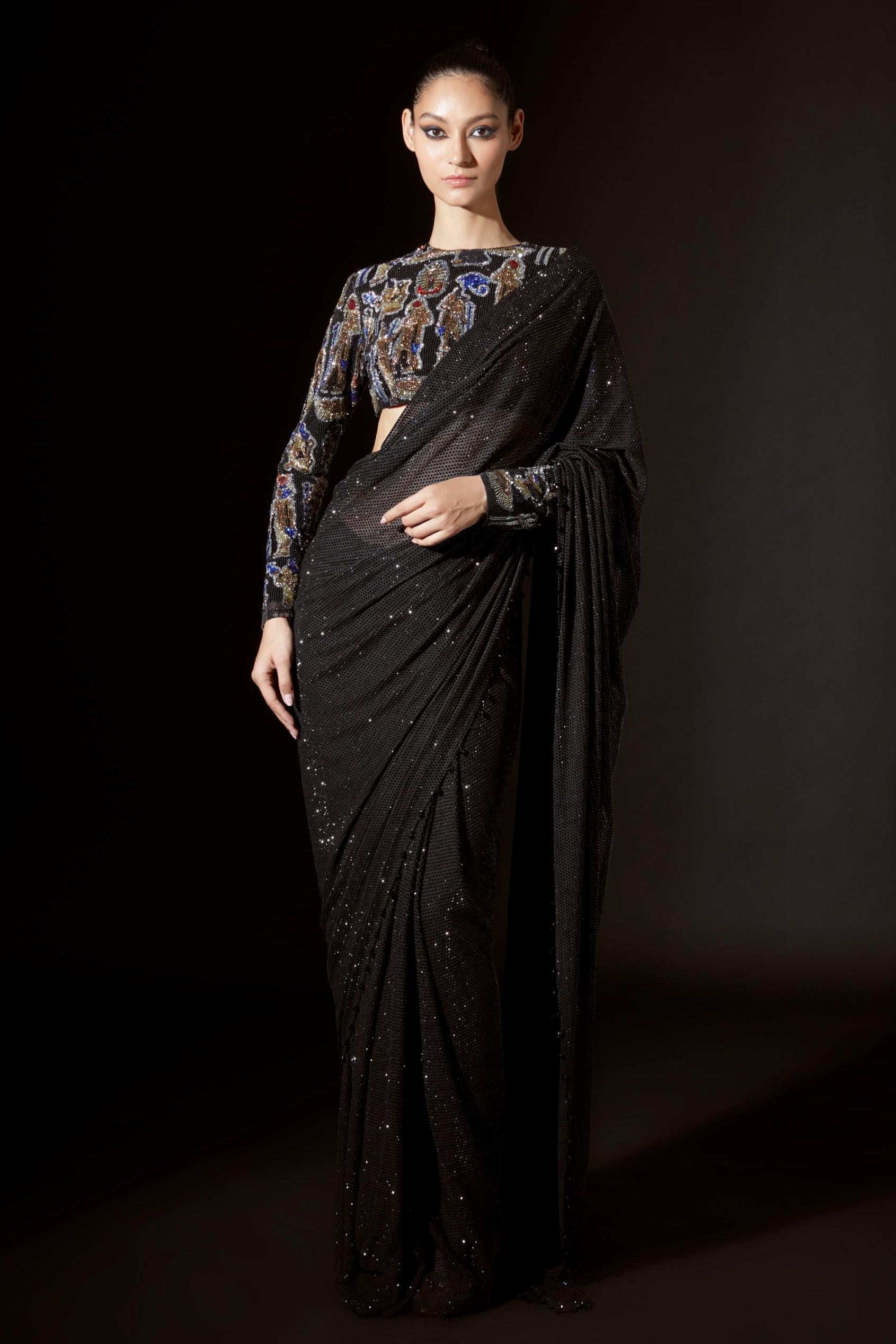 Radiate sophistication with this figurine crystal-embellished top designed with intricate details that sparkle brilliantly in the light. Paired with a sleek black pre-stitched saree this ensemble strikes the perfect balance between opulence and timeless elegance making it a standout choice for modern occasions.