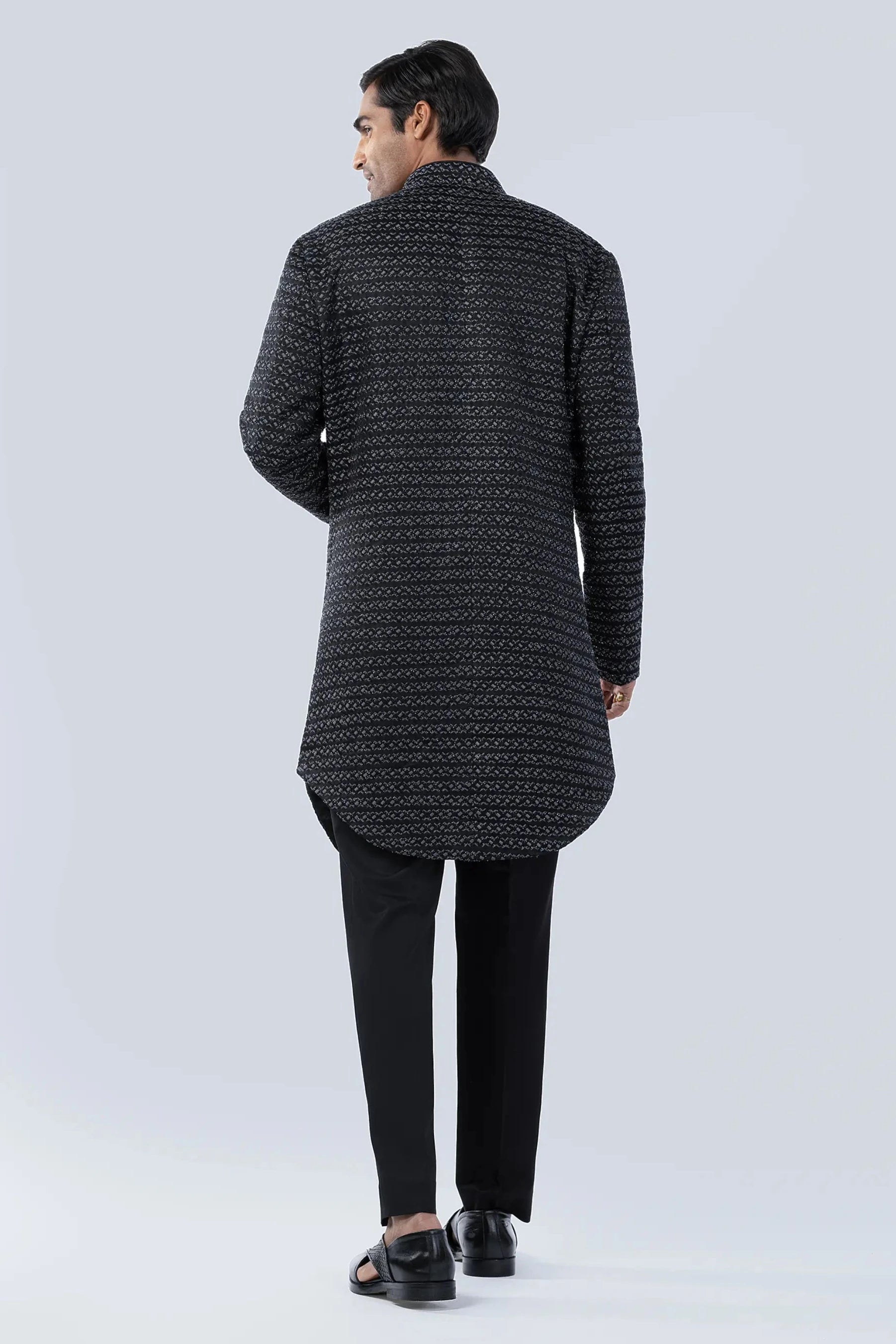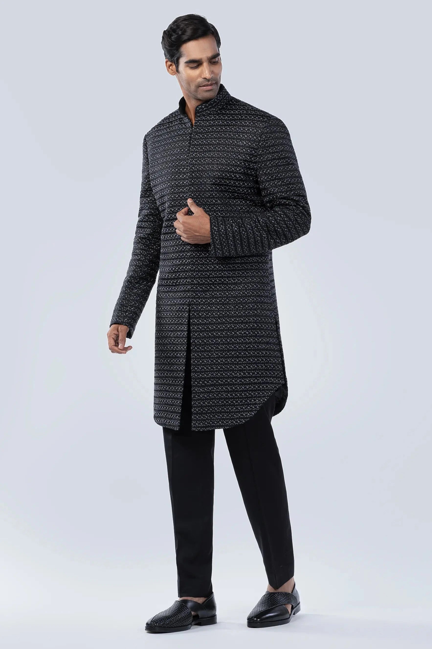 Step into the spotlight with the Black Bead and Threadwork Embroidered Bucket Cut Sherwani, a striking blend of contemporary style and traditional craftsmanship. The deep, rich black hue provides a bold, sophisticated base, while the intricate bead embroidery and detailed threadwork add layers of texture, elegance, and refinement. Perfect for weddings, receptions, or any formal occasion, this sherwani ensures a standout look for the groom or any special guest.