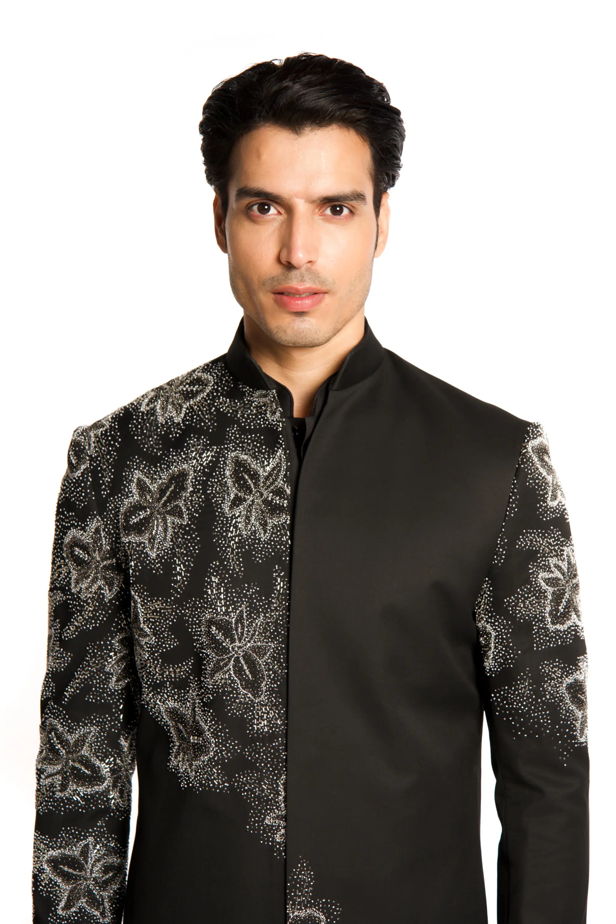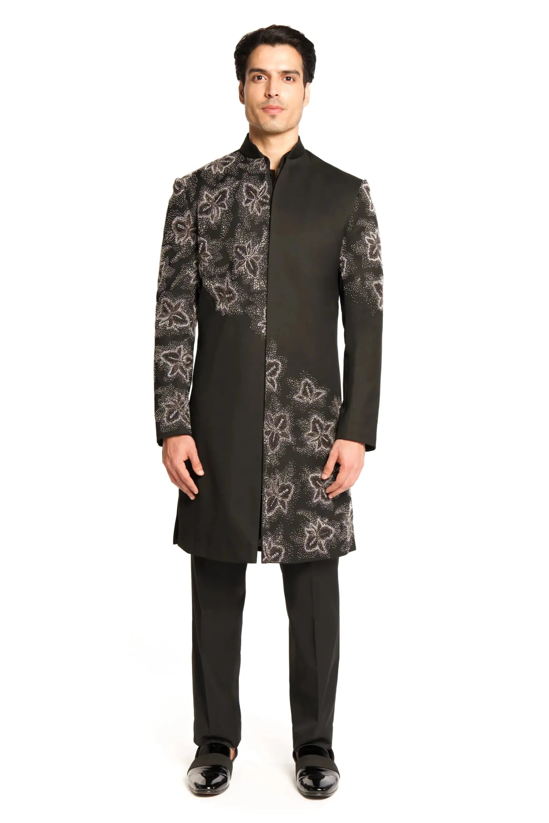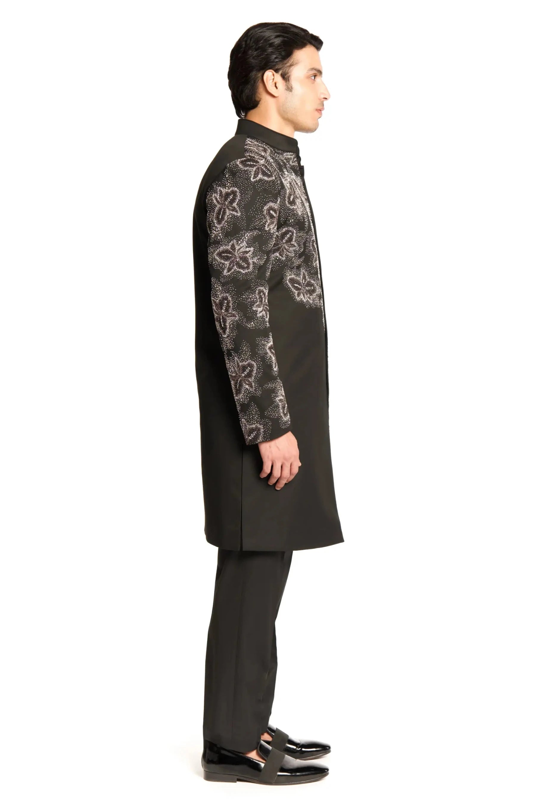 Black bead cut dana embroidered placement sherwani set