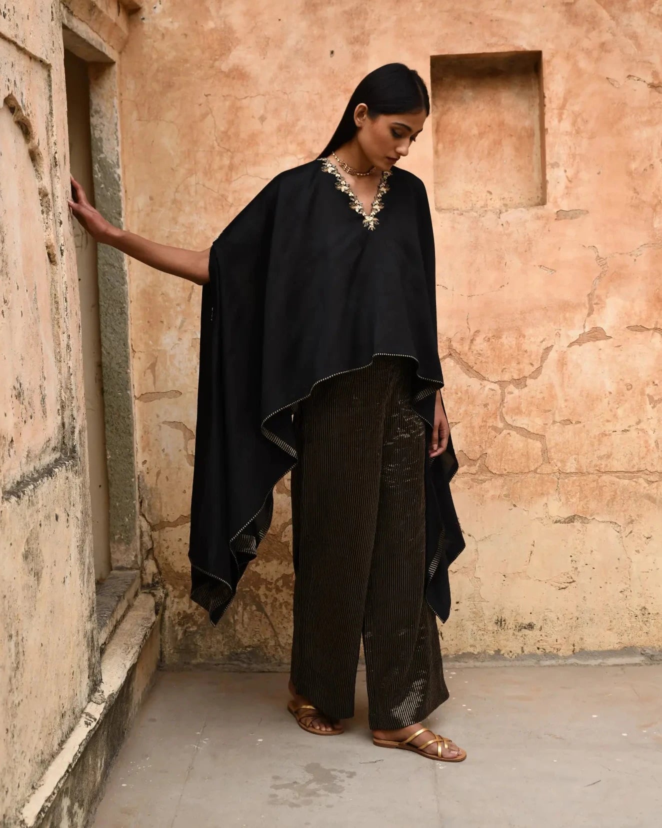 This stunning black dupatta-style cape features intricate phool guccha embroidery along the neckline, adding a touch of elegance and sophistication to its design. The lightweight fabric drapes beautifully, creating a flattering silhouette that enhances any outfit. Paired with stylish tissue striped pants, this ensemble offers a perfect blend of modern flair and traditional artistry. Ideal for festive occasions or special events, this cape not only elevates your look but also provides versatility, making it a must-have addition to your wardrobe.