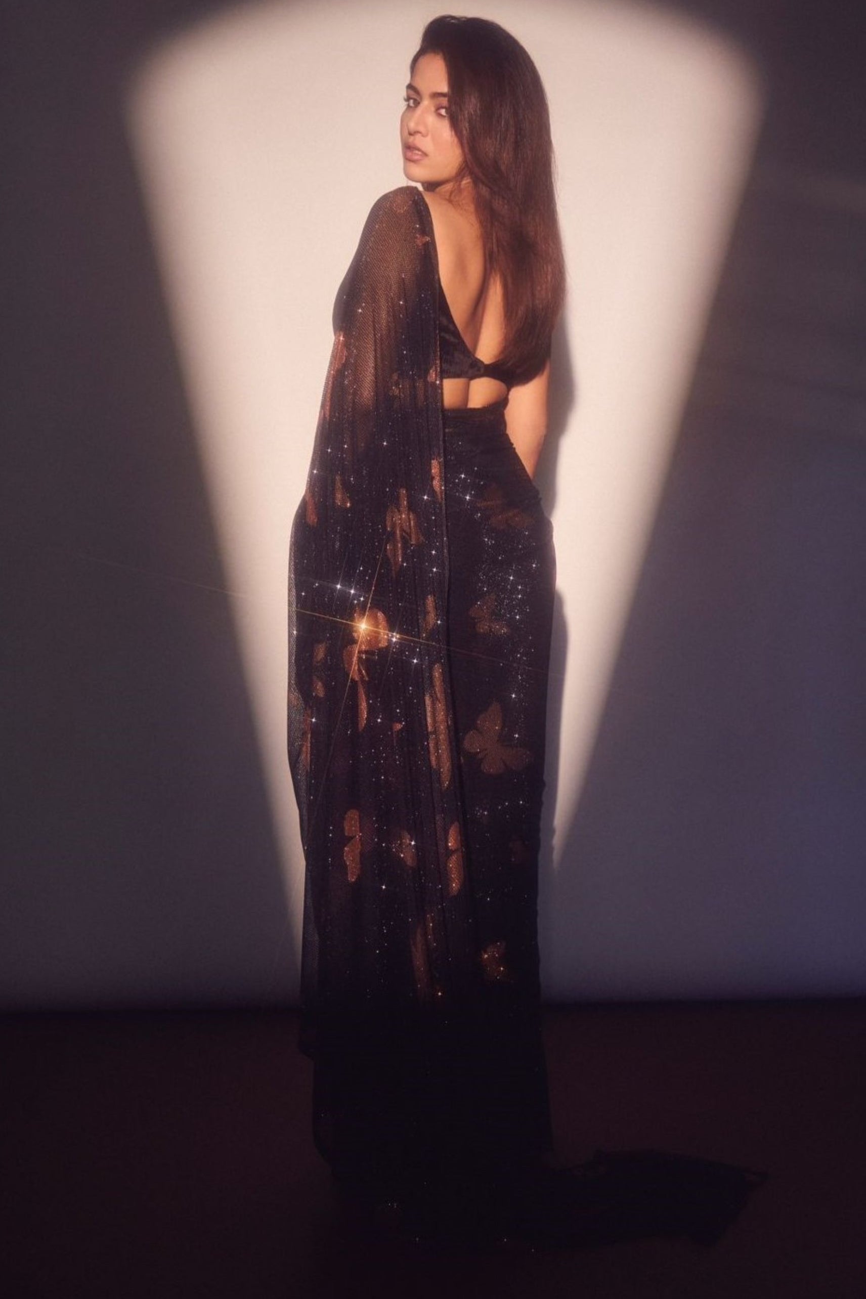 Embrace elegance with the Celestial Flutter Saree Set, a striking blend of modern glamour and timeless charm. The black crystal net saree shimmers with intricate gold butterfly motifs that flutter with every step, adding a whimsical touch to your look. It’s paired with a luxurious black velvet blouse, designed with a bold deep neckline and sleek strappy silhouette. Perfect for evening soirées, weddings, or festive occasions where you want to stand out.