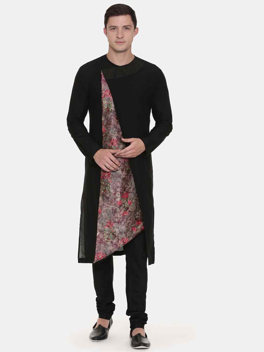 Refine your style with our Black Printed Silk Chanderi, featuring intricate embroidery details that enhance its luxurious appeal. The rich black silk Chanderi fabric showcases a sophisticated print, while the delicate embroidery adds a touch of elegance. This versatile piece pairs beautifully with a chudidar, offering a complete and polished look perfect for special occasions and festive events. Embrace classic elegance with a contemporary twist, ensuring you stand out with grace and sophistication.