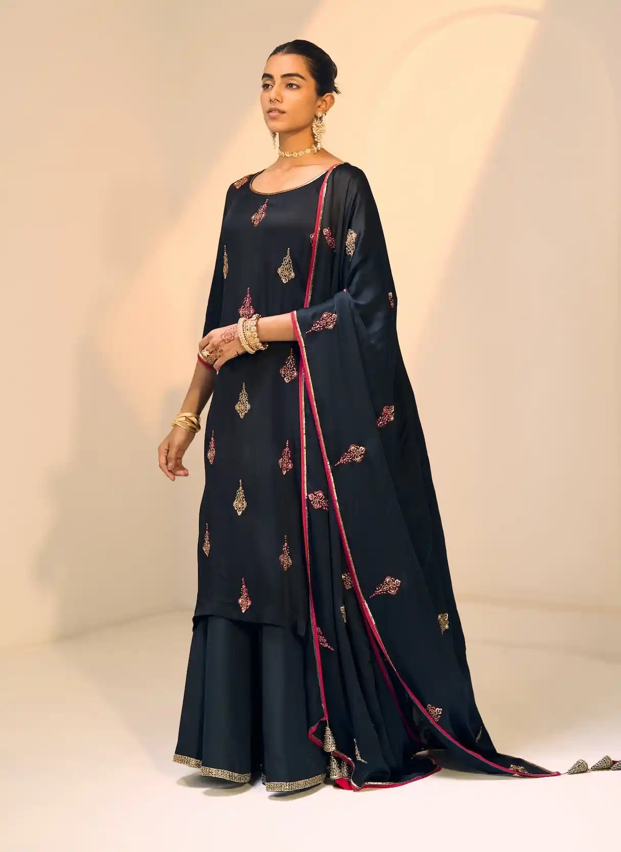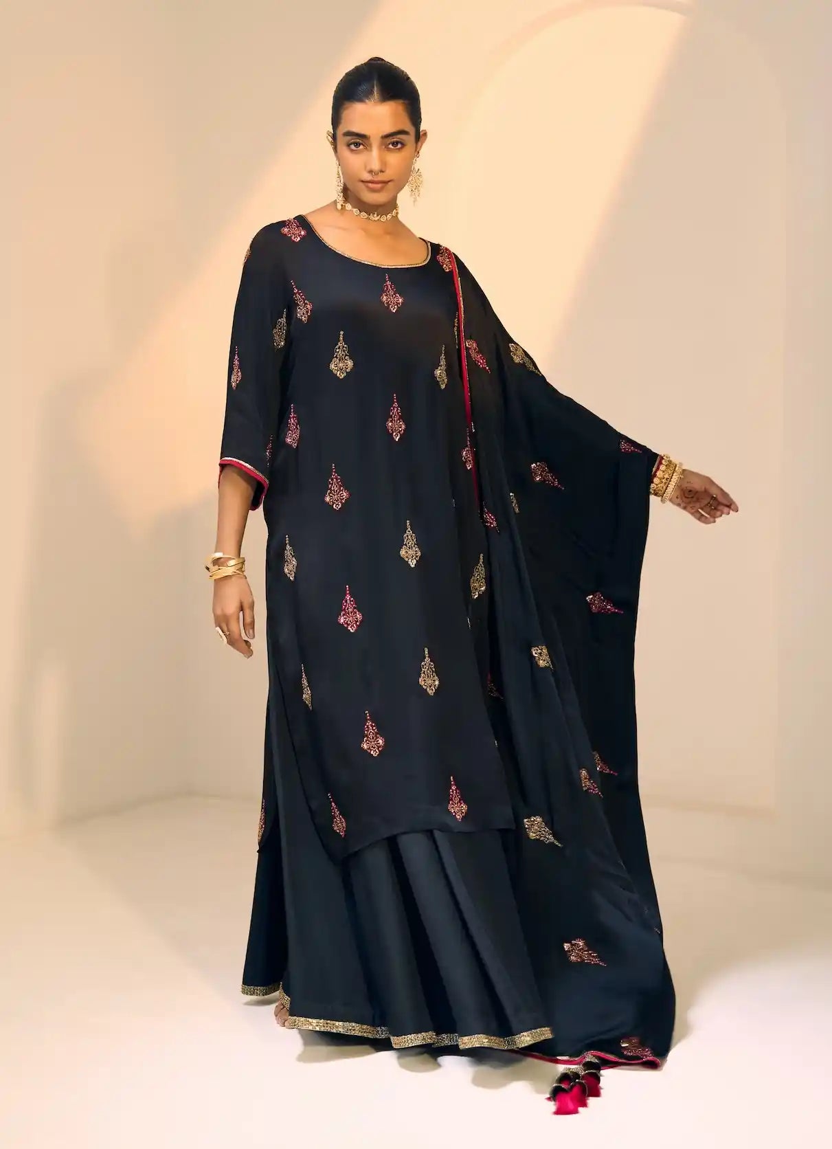 Elevate your wardrobe with the black chavi kurta set, a quintessential blend of elegance and sophistication. Crafted from sumptuous satin georgette, the kurta features a deep black hue that radiates timeless charm, making it the perfect choice for both formal events and intimate gatherings. Paired with sleek satin silk pants, this ensemble offers a comfortable yet chic silhouette that flatters every figure. The matching satin georgette dupatta adds a touch of refinement and versatility, ensuring you exude grace on any occasion. Step into confidence with the black chavi kurta set—a true statement piece that defines your style.
