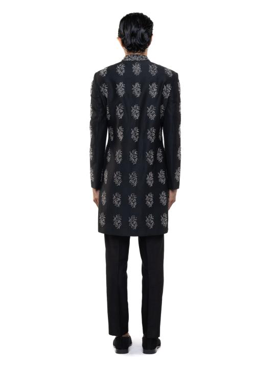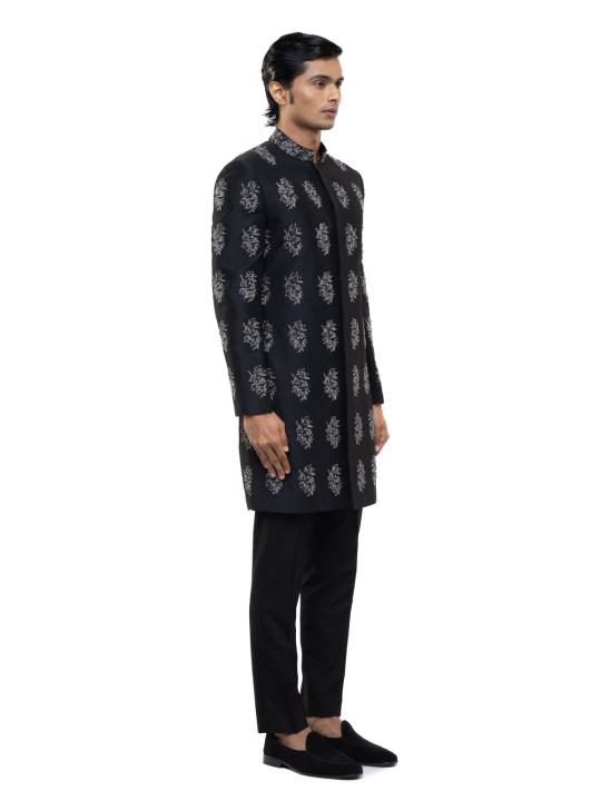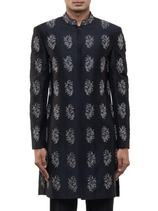 Make a bold statement with this Black Chrome Silk Sherwani Set, crafted in luxurious silk and adorned with intricate embroidered motifs. Featuring a stand collar, concealed placket, and elegant Mother of Pearl buttons, it blends tradition with modern refinement. The regular fit and straight hem offer timeless appeal, making it a perfect choice for weddings or festive occasions. Elevate your celebration style with this sophisticated ensemble.