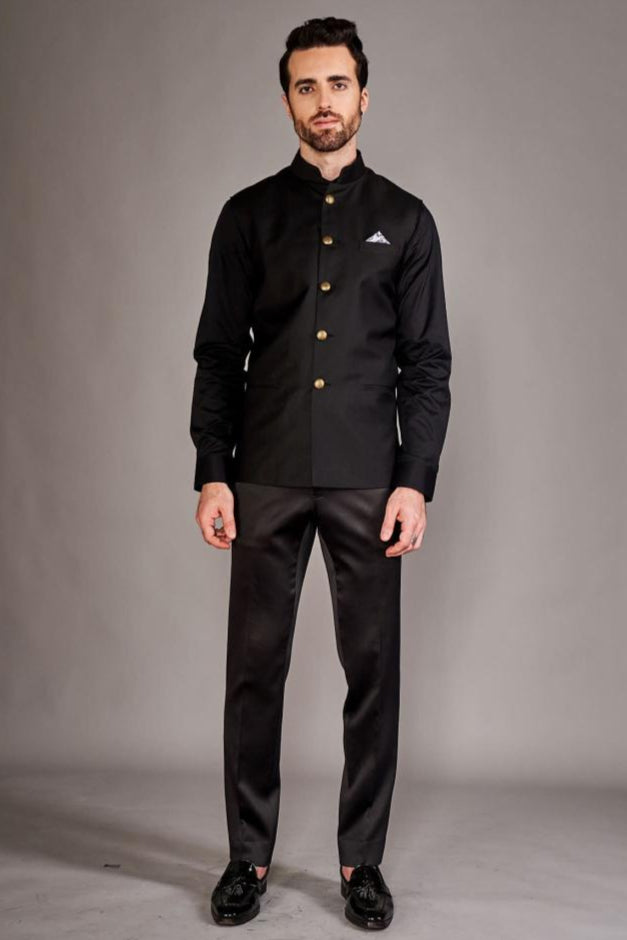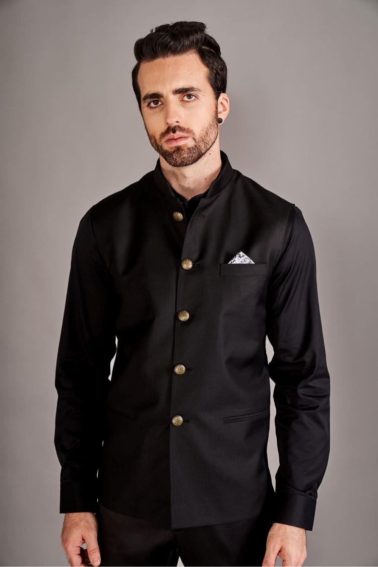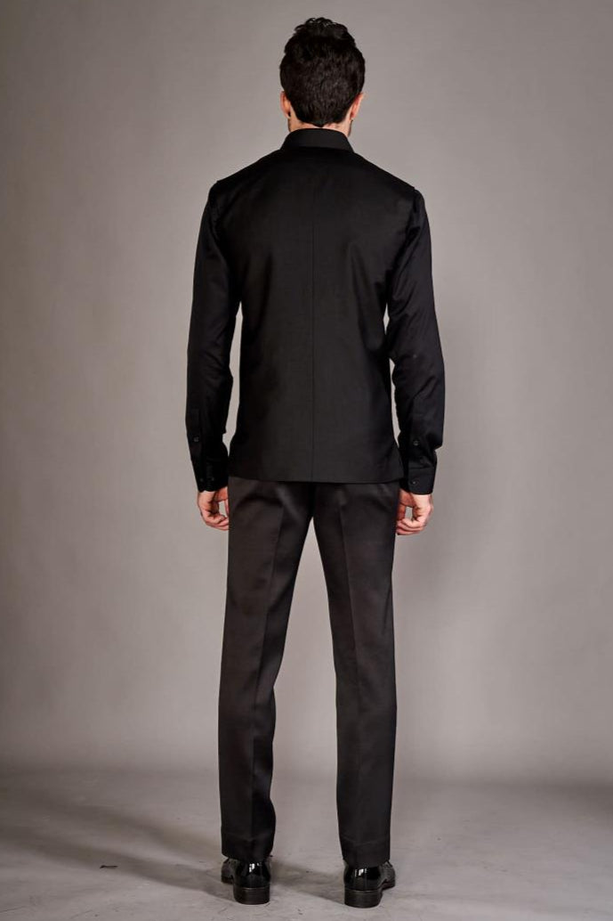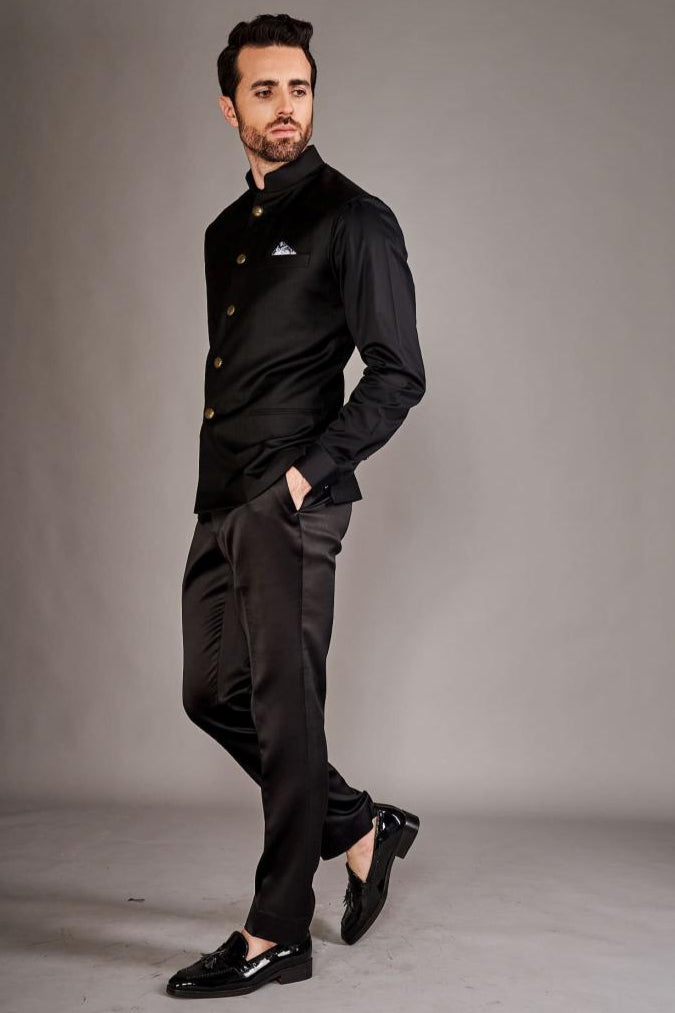 Achieve a sleek, monochromatic look with this Black Classic Bundi paired with a Black Chinese Collar Shirt. The understated elegance of the black Bundi is perfectly complemented by the sharp, modern black Chinese collar shirt, creating a bold and sophisticated ensemble. Ideal for evening events, formal gatherings, or stylish celebrations, this combination offers a refined, contemporary edge.