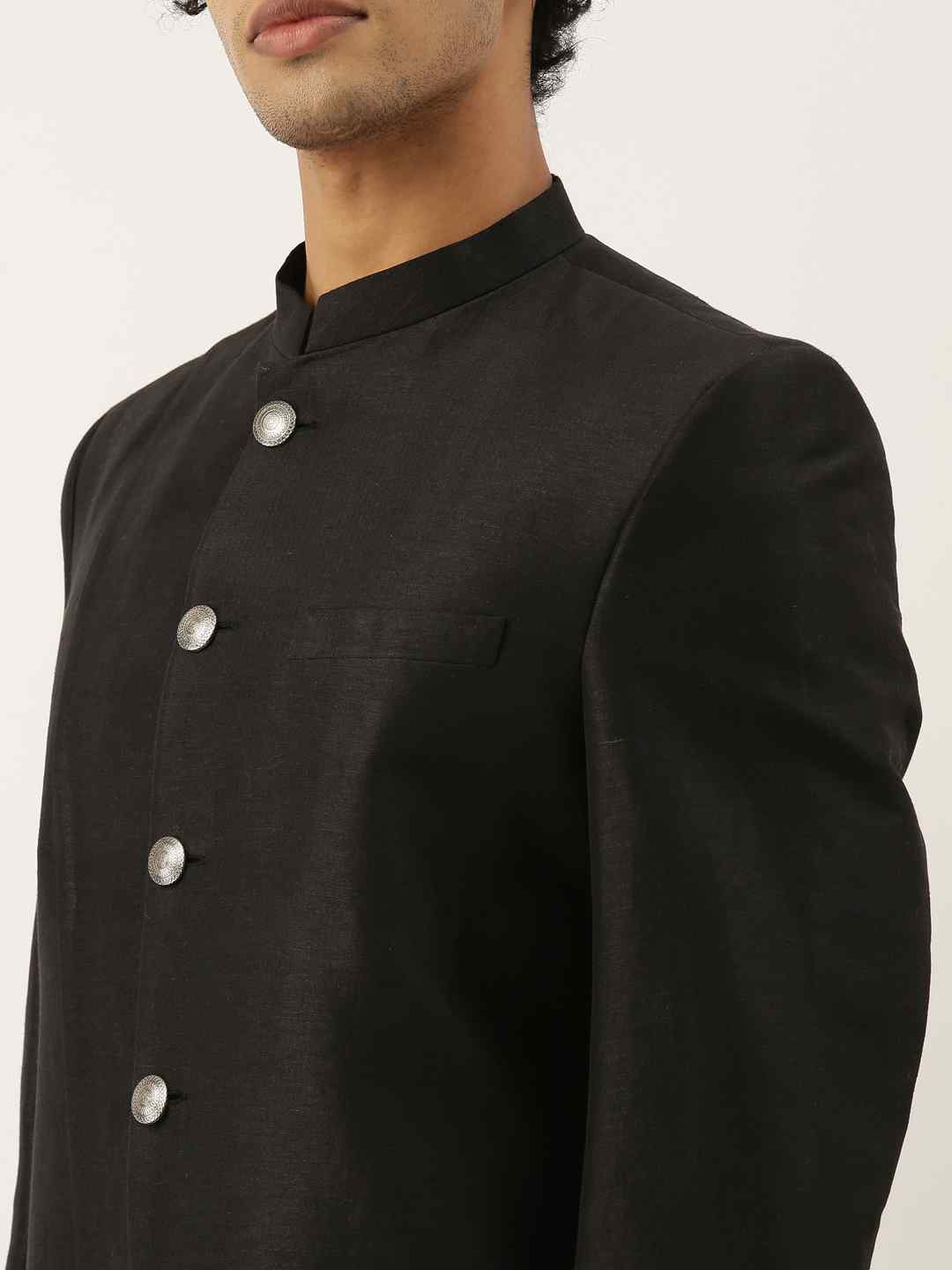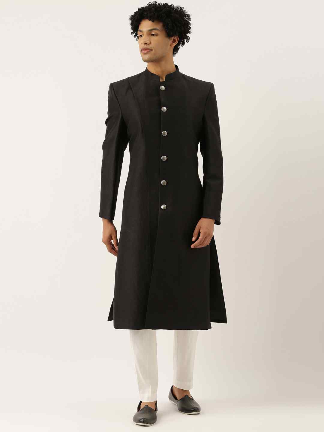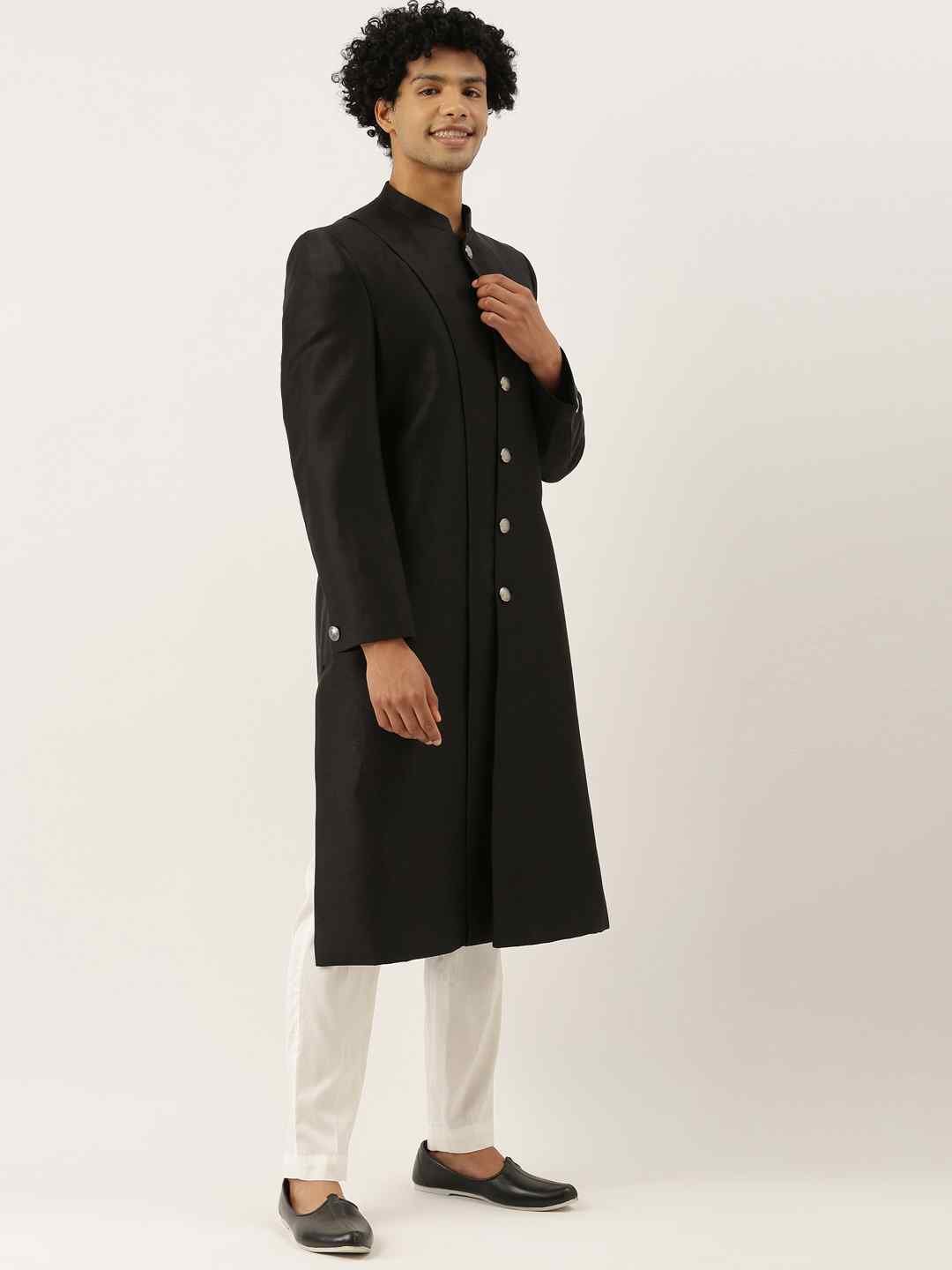 Make a statement with our Stylish Cut-Away Black Sherwani, crafted from rich silk fabric for an opulent look and feel. The sophisticated cut-away design adds a modern twist to traditional elegance, while the luxurious silk enhances its timeless appeal. Perfectly paired with white pants, this sherwani offers a striking contrast that ensures a refined and polished appearance. Ideal for special occasions and formal events, this sherwani effortlessly combines classic style with contemporary flair.