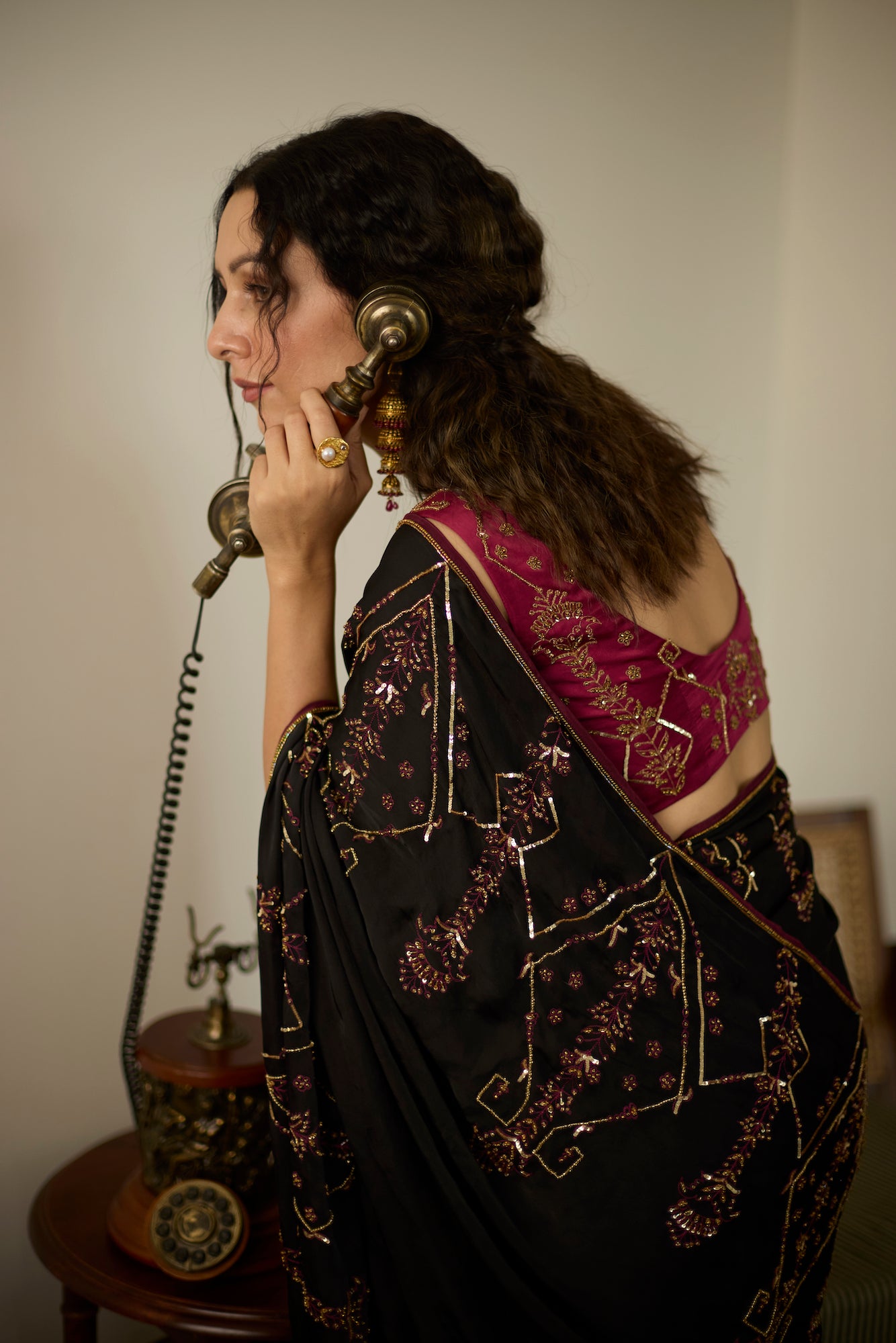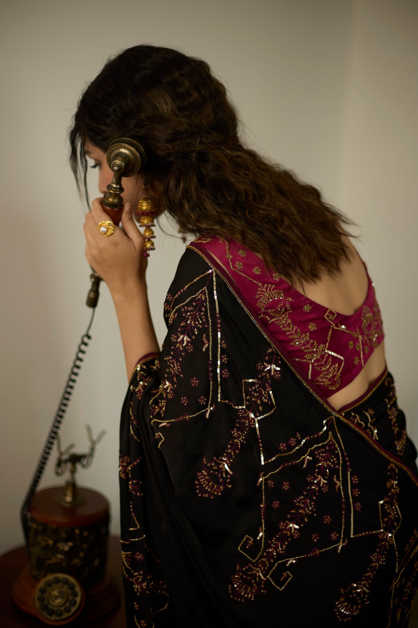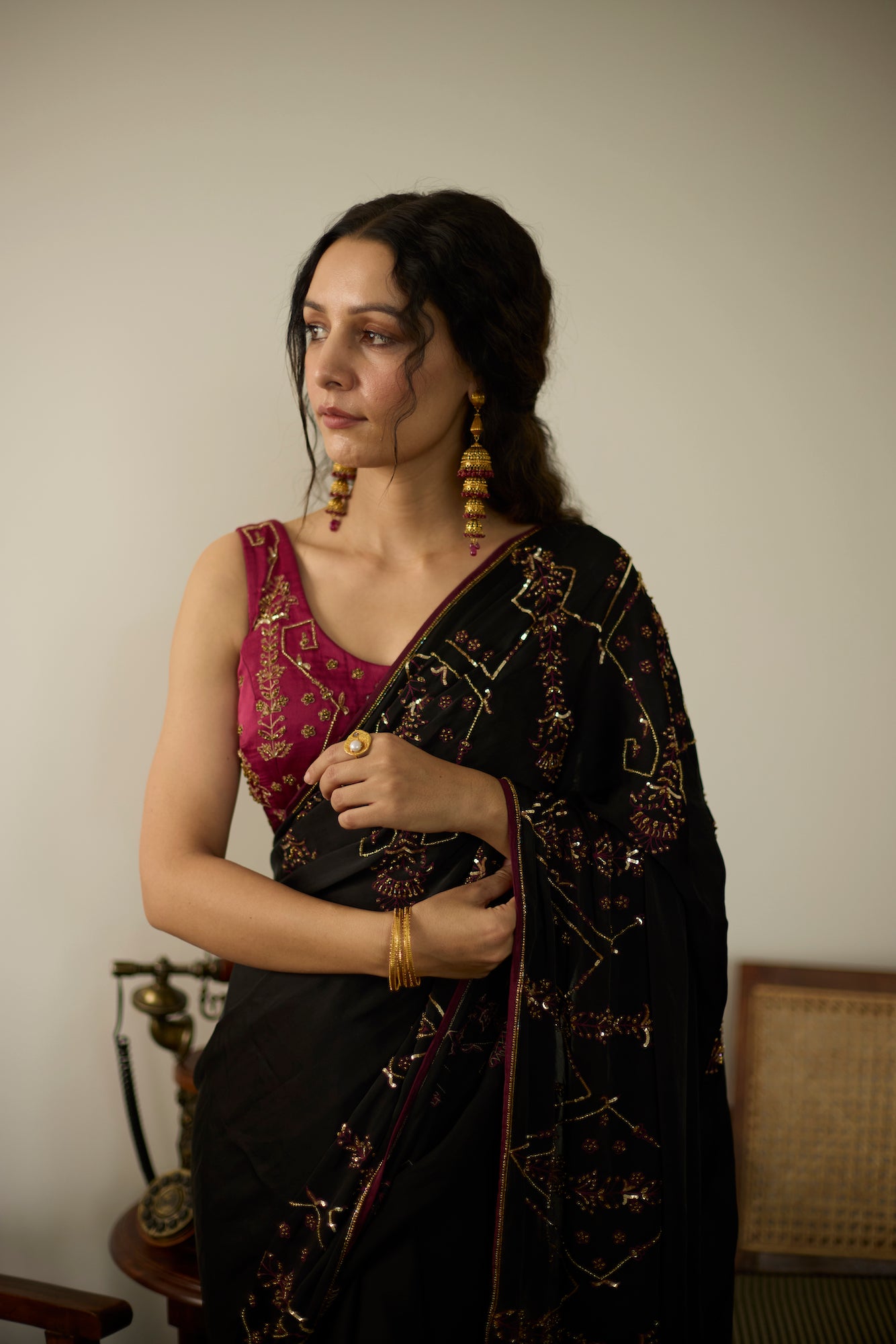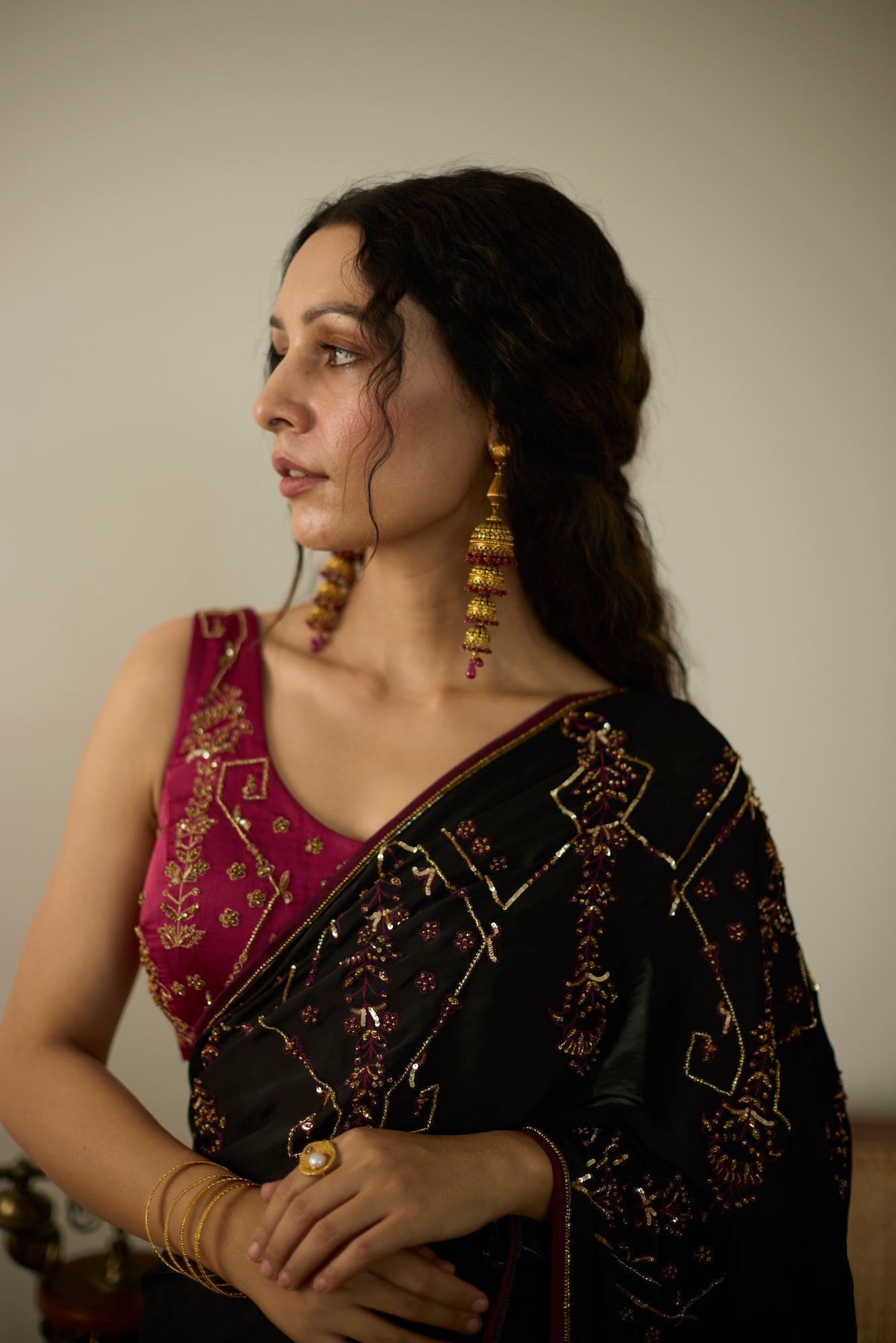Make a bold statement in the Black Cocktail Hand-Embroidered Saree. With intricate detailing and a timeless drape, this ensemble is perfect for evening soirees, weddings, and special occasions.