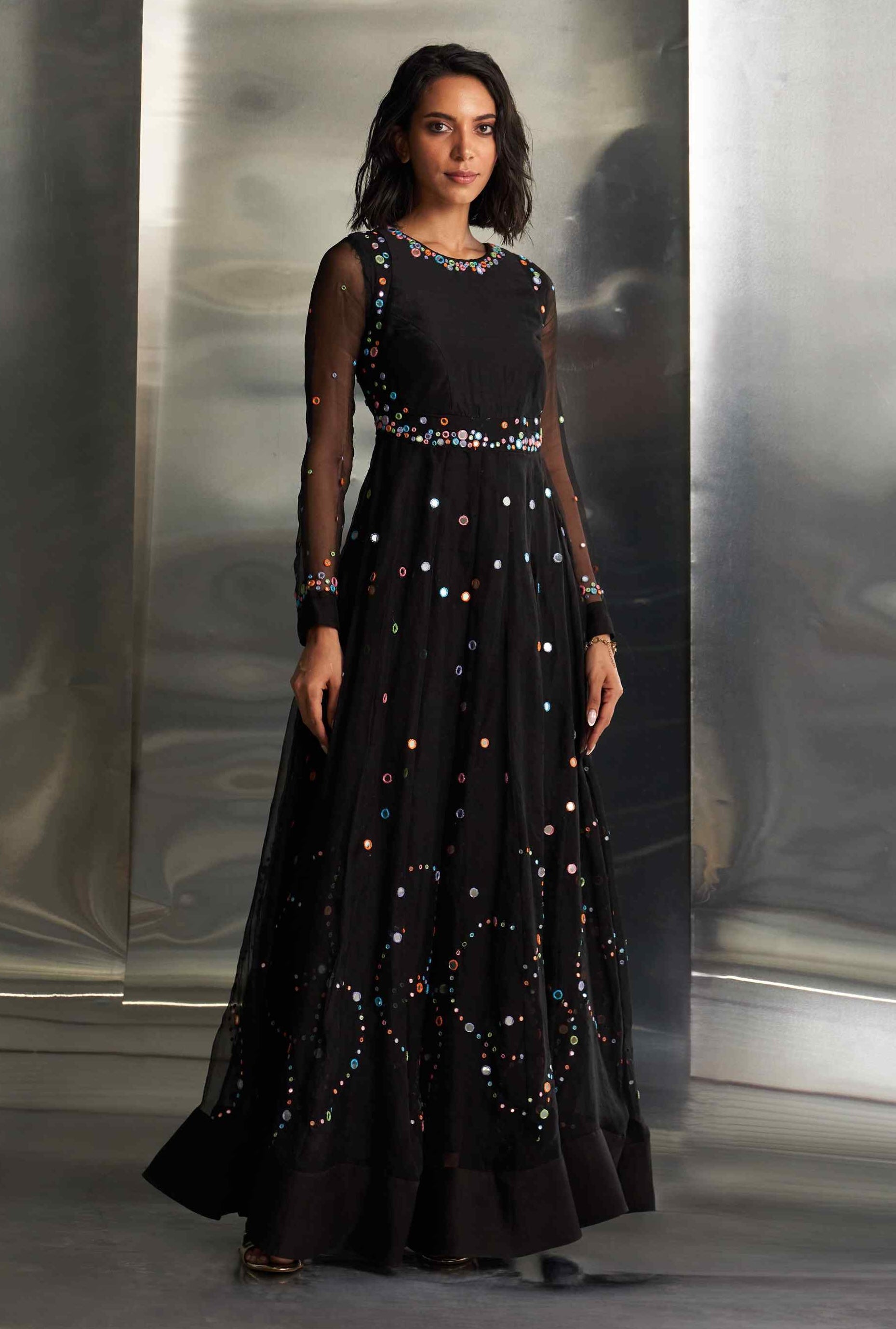 This midnight stunner features a flared Chanderi anarkali that mesmerizes with its vibrant embroidery, enhanced by shimmering foil accents and real mirror work. The ensemble embodies a captivating blend of exquisite craftsmanship and timeless elegance, creating a striking outfit that commands attention and admiration. Perfect for making a statement at any special occasion, this anarkali radiates sophisticated charm and unparalleled beauty.