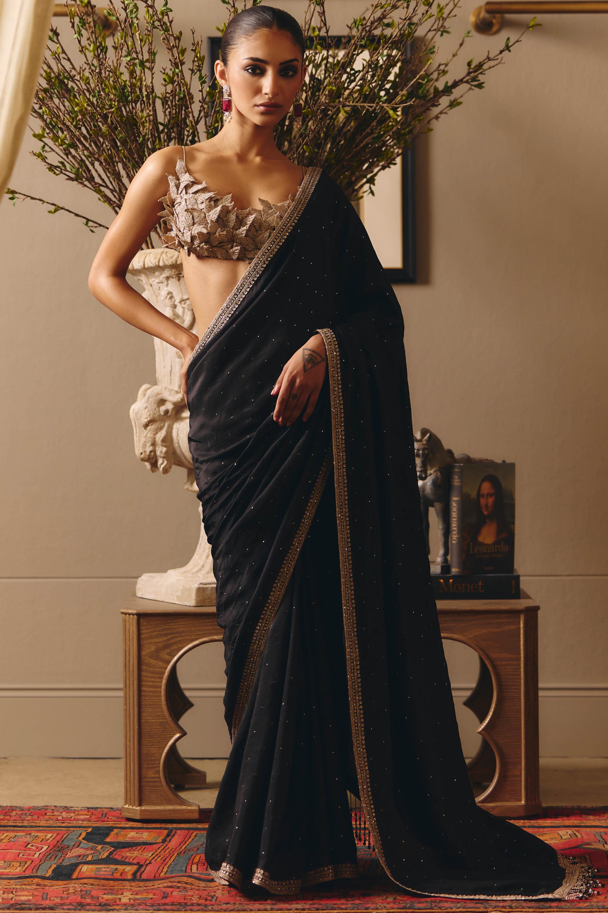 Unleash your inner diva with our Black Couture Savage Winged Saree—a bold fusion of tradition and avant-garde design. Crafted for the modern muse, this dramatic black saree features sculptural winged drapes that make a powerful fashion statement. Perfect for evening galas, red carpet events, or any occasion where you want to turn heads, this ensemble blends edgy couture aesthetics with timeless Indian elegance.