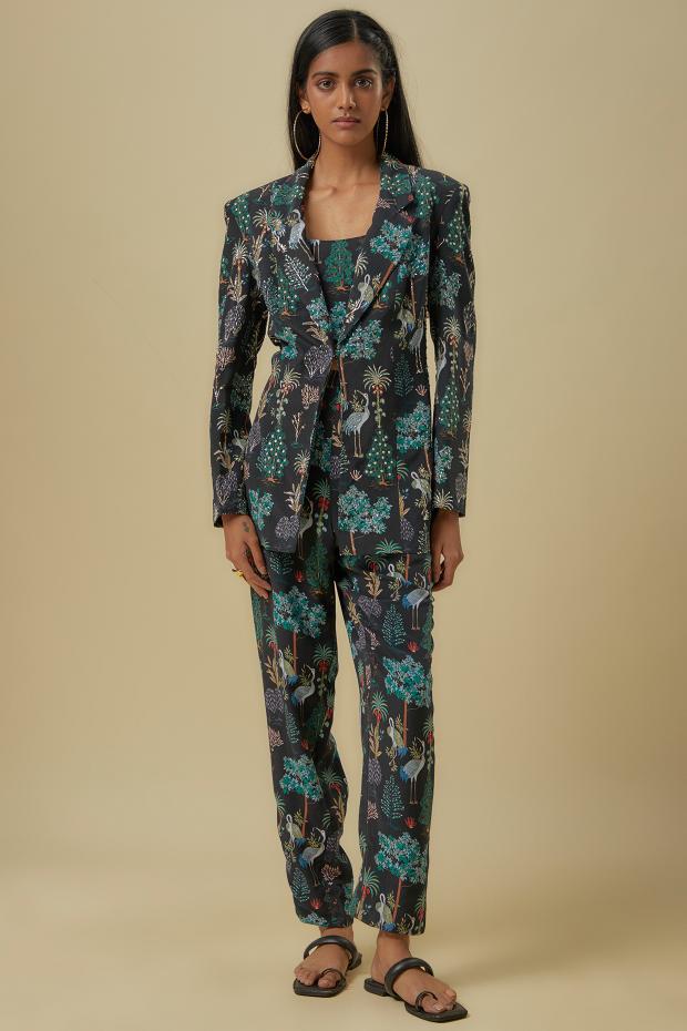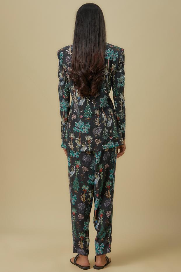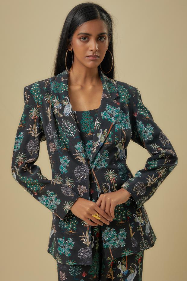 Make a bold statement with our Black Crane Print Lifted Jacket Set. Featuring a dramatic, lifted silhouette, the printed jacket showcases elegant crane motifs that exude artistry and movement. Paired with a sleek plain bustier and tailored pants, this ensemble strikes the perfect balance between power dressing and playful elegance. Ideal for cocktail events, evening soirees, or fashion-forward gatherings, it's a standout look for the modern trendsetter.