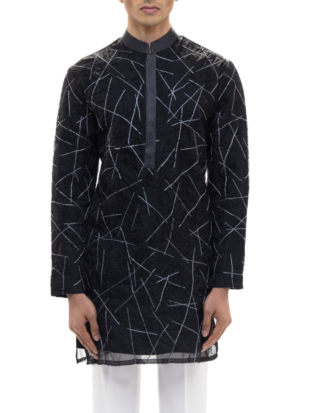 Bold and contemporary, this Black Organza Crushed Metallic Kurta Set is crafted for standout style. Made from sheer organza with a crushed metallic finish, it offers a unique texture and a subtle shimmer. Designed with a stand collar, concealed placket, and elegant Mother of Pearl buttons, the straight hem and regular fit ensure a sleek silhouette. Ideal for evening celebrations, receptions, or high-fashion festive events.