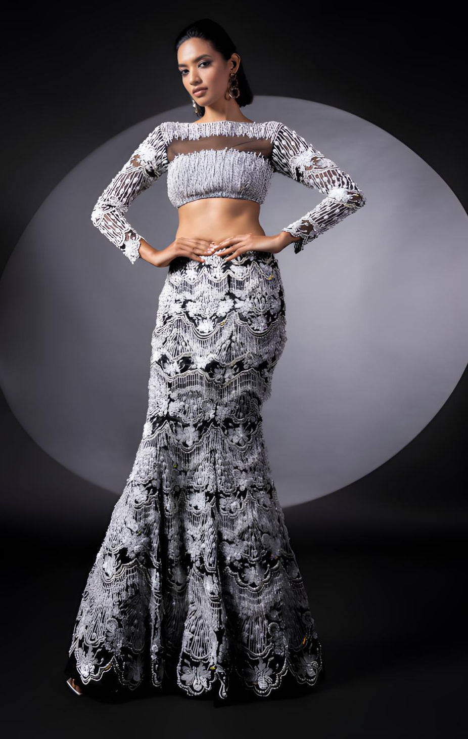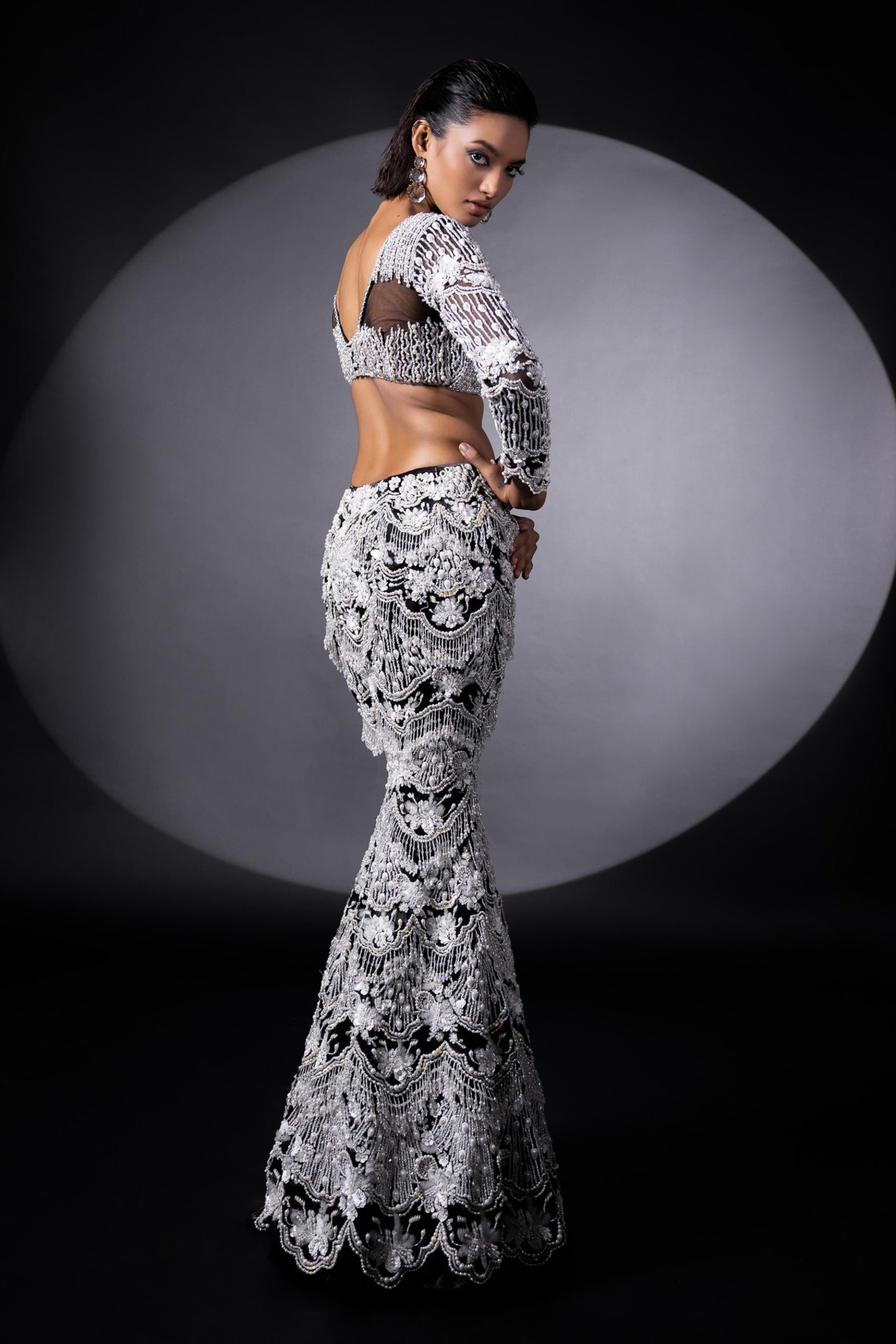 Bold and breathtaking, the Black Diora Lehenga Set is designed for the modern muse who embraces drama with elegance. Featuring a structured blouse, voluminous lehenga, and a soft dupatta, this ensemble is adorned with intricate embellishments and textured detailing that create a striking play of light and shadow. The deep black hue lends timeless sophistication, making it ideal for receptions, evening weddings, or high-impact festive occasions. Crafted for the woman who isn't afraid to own the spotlight — with poise, power, and style.