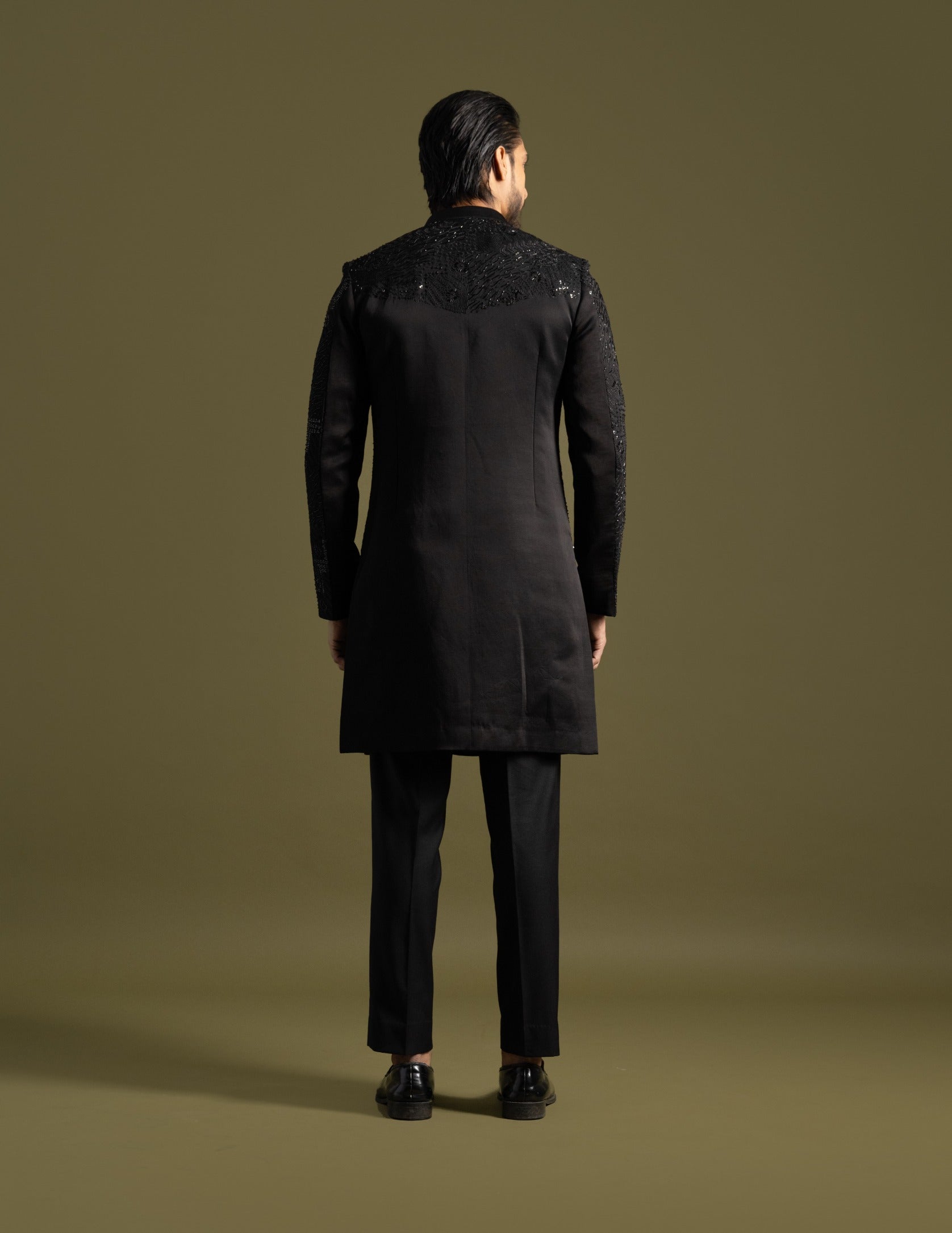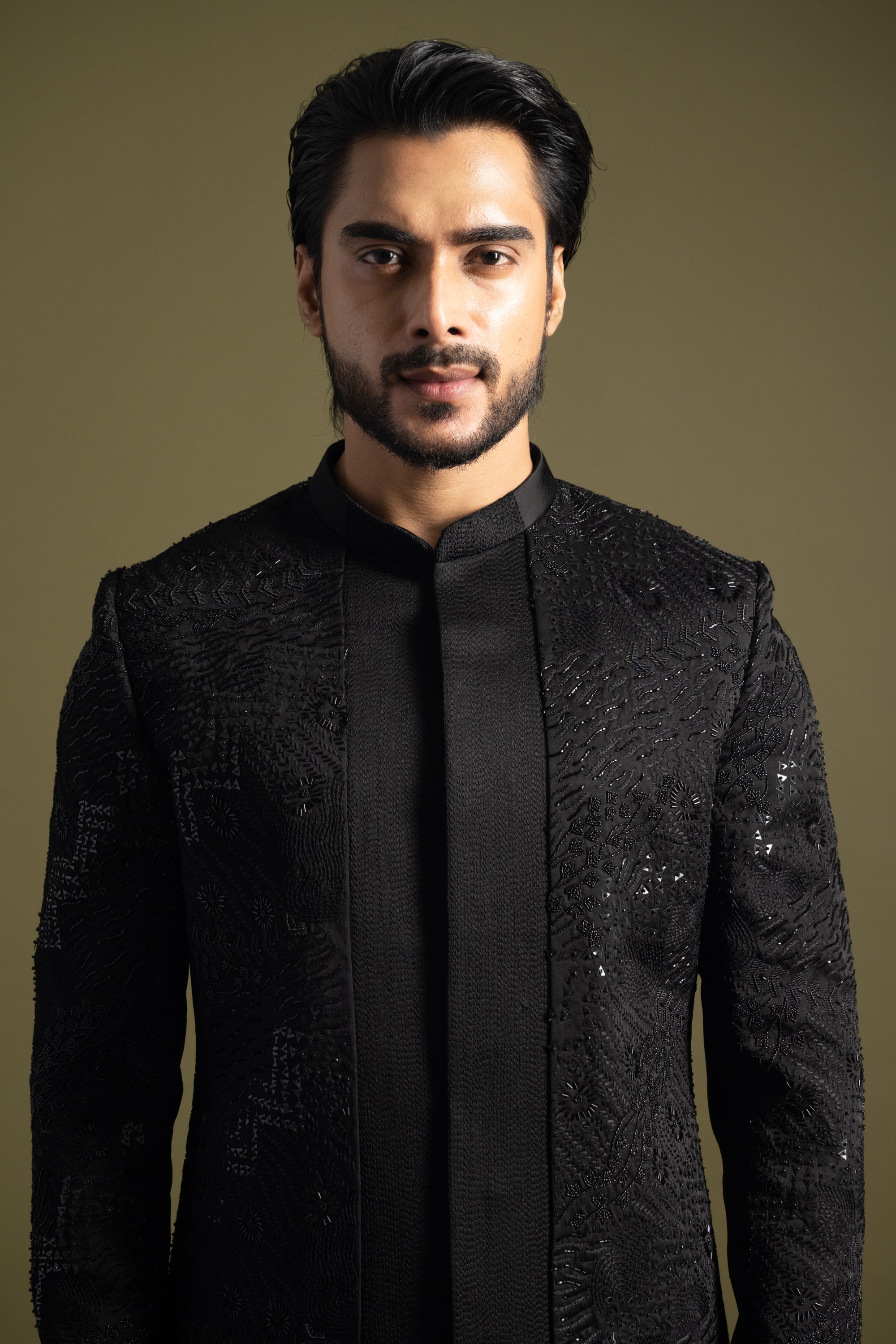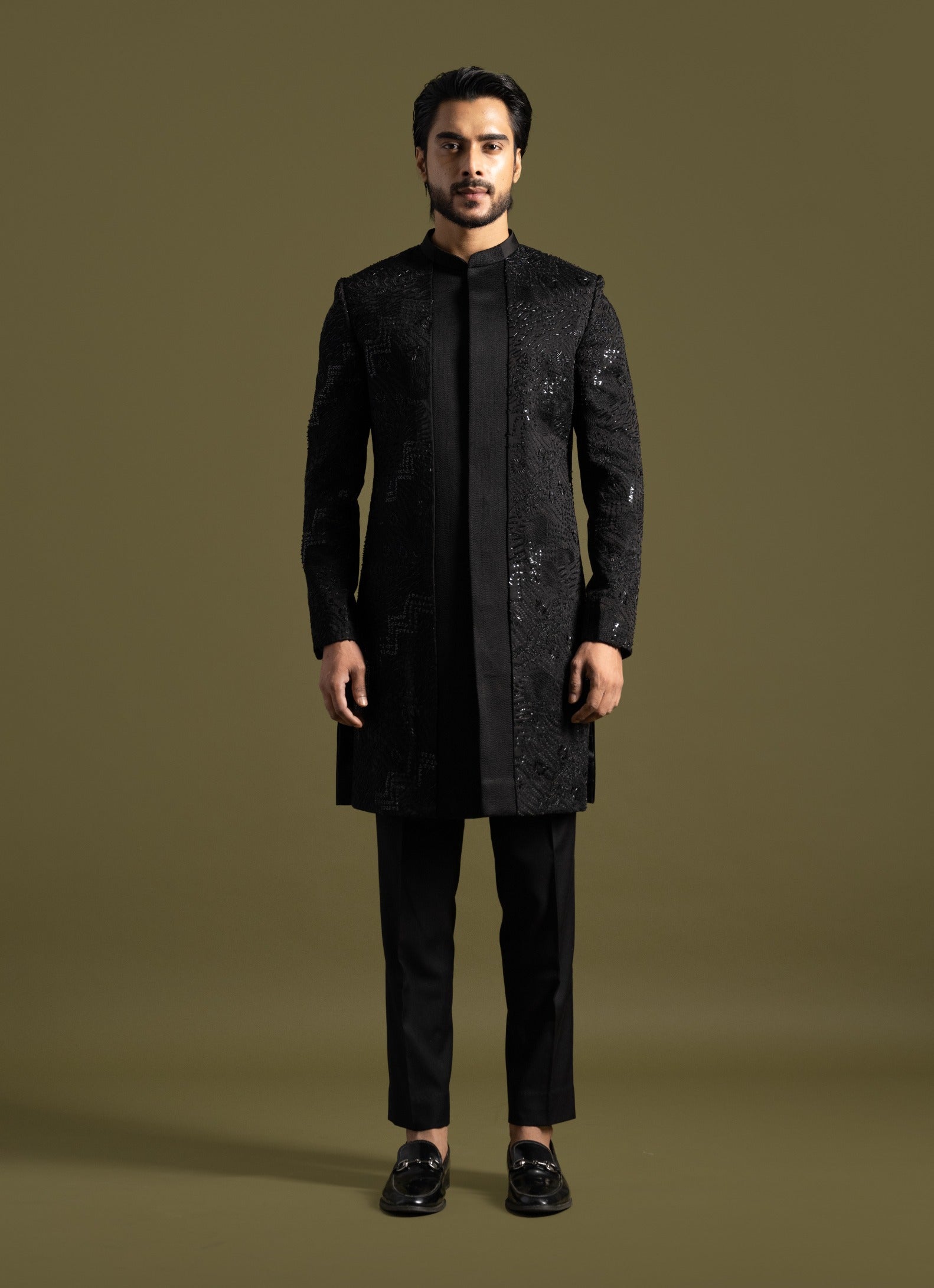 Elevate your wardrobe with our black double-panel linen satin achkan, designed for the modern gentleman who values sophistication. Featuring a distinctive stitch line detail on the center panel, this achkan is adorned with exquisite thread work and intricate chir embroidery, complemented by shimmering sequence accents that enhance its luxurious appeal. Paired with slim fit trousers, this ensemble offers a refined and tailored look, perfect for formal events and upscale gatherings.