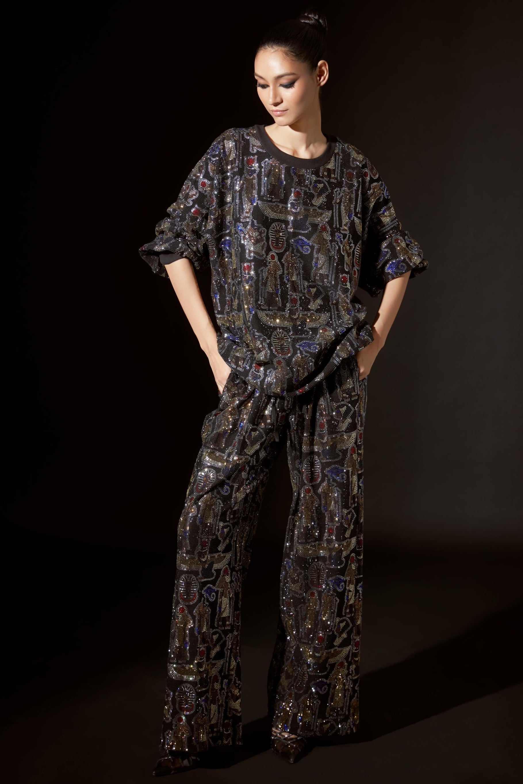 Elevate casual wear with this figurine crystal-embellished oversized sweatshirt, radiating opulence and elegance with intricate, light-catching details. Paired with relaxed baggy pants, this ensemble effortlessly blends comfort with high-fashion glamour, perfect for a chic, statement-making look.