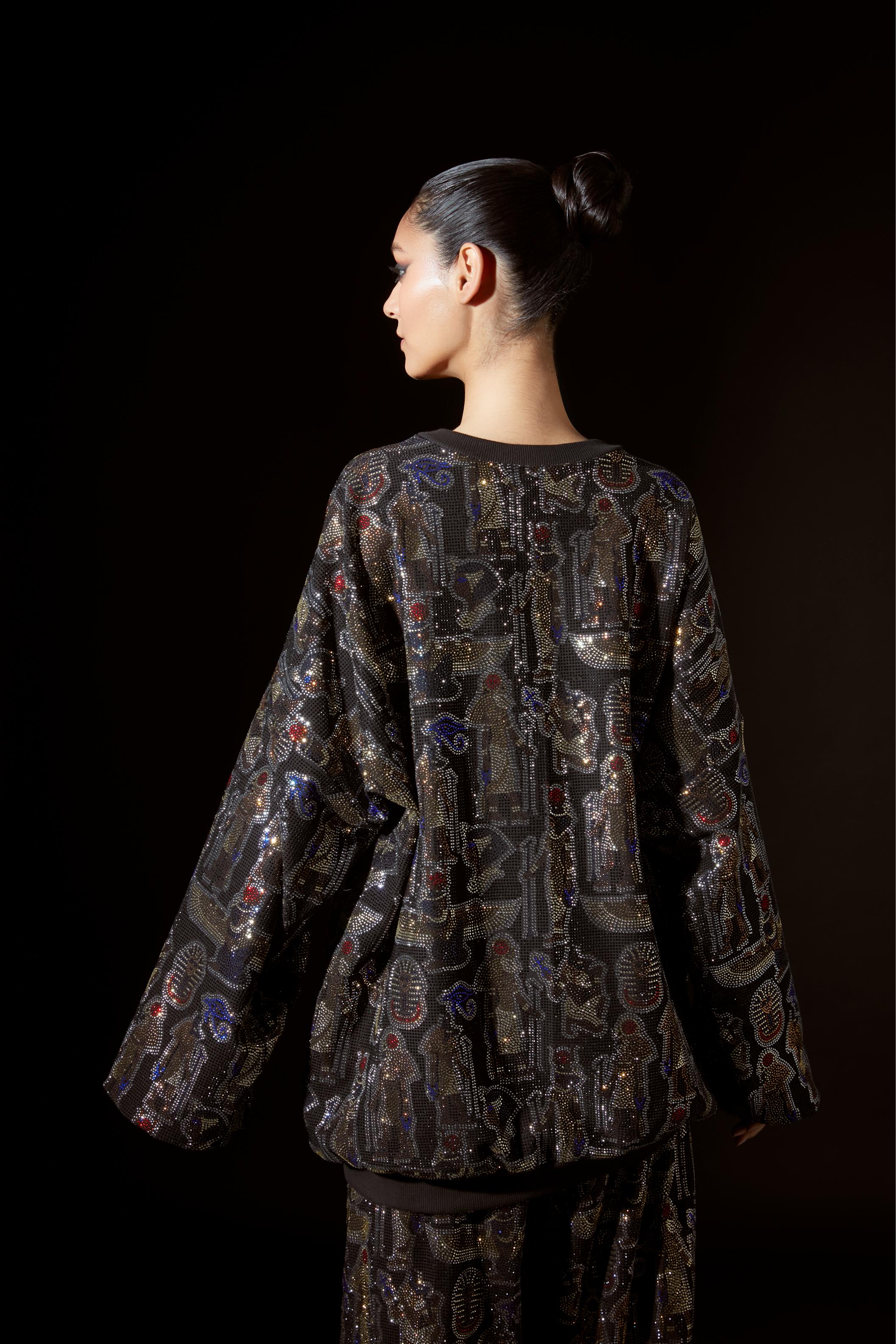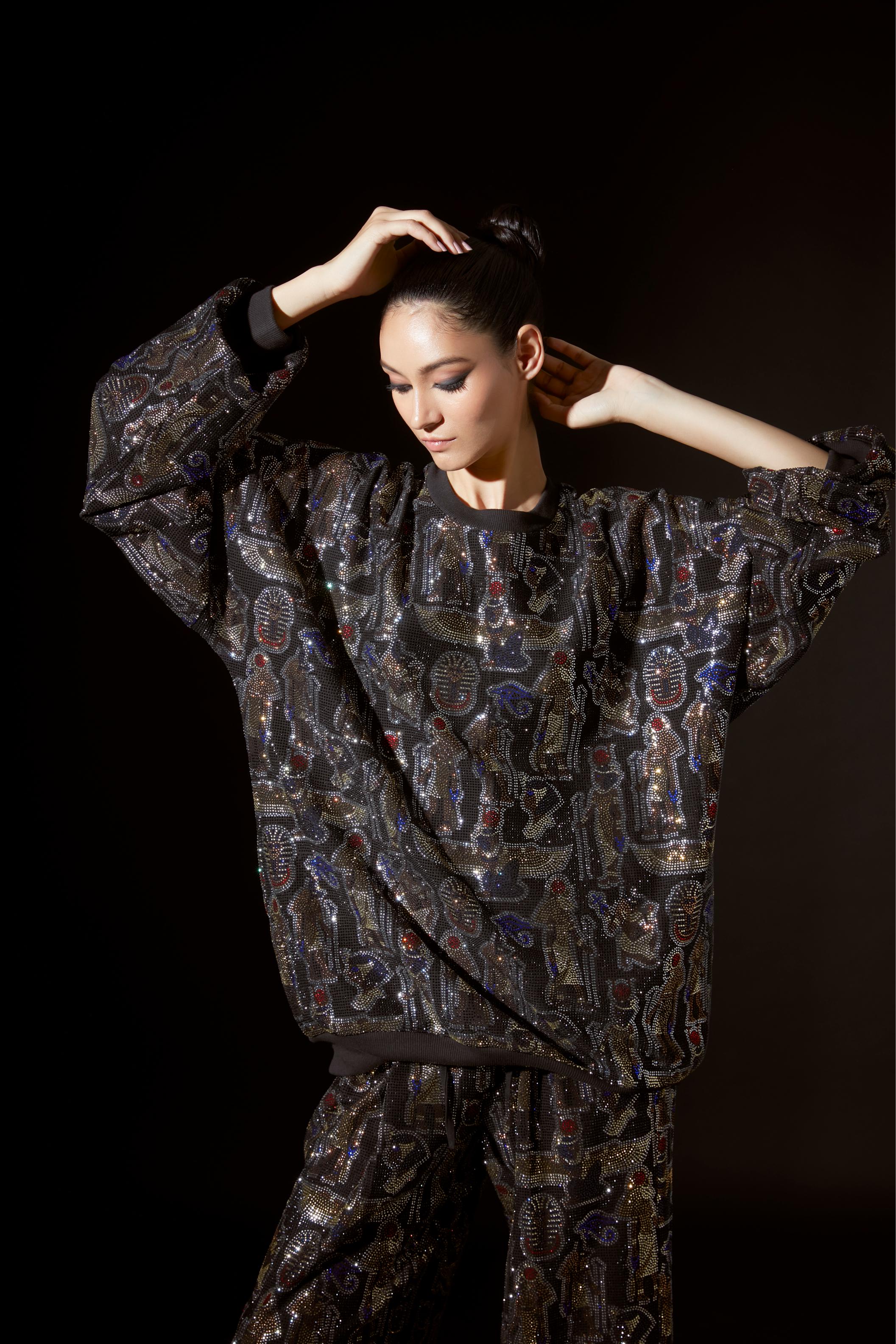 Elevate casual wear with this figurine crystal-embellished oversized sweatshirt radiating opulence and elegance with intricate light-catching details. Paired with relaxed baggy pants this ensemble effortlessly blends comfort with high-fashion glamour perfect for a chic statement-making look.