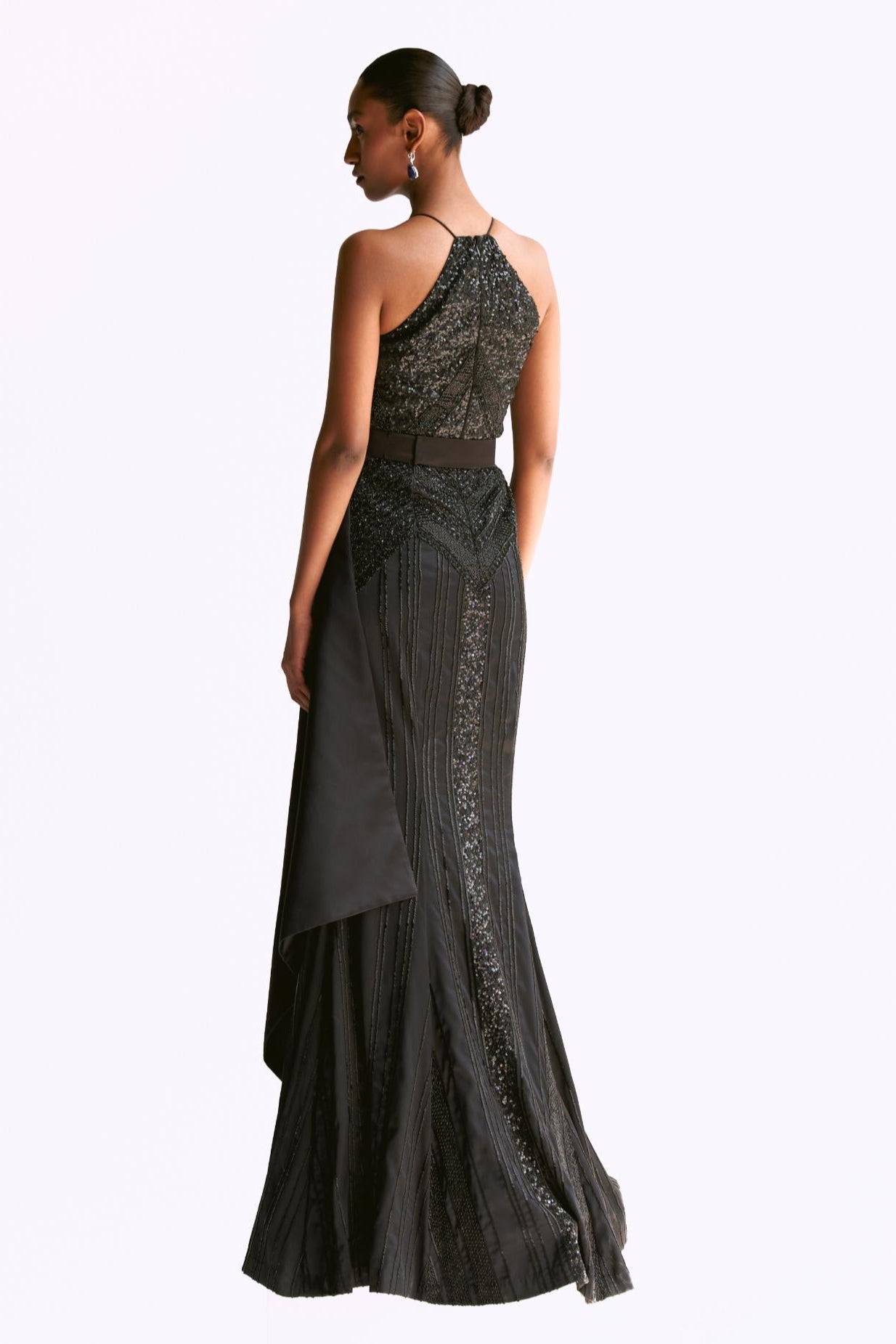 The Black Embellished Trumpet Reim Gown exudes sophistication and timeless allure. Meticulously crafted with exquisite detailing, this stunning gown features intricate embellishments that capture light and attention, creating a mesmerizing effect. The form-fitting trumpet silhouette gracefully accentuates the figure, flowing out into a dramatic flare at the hem, while the luxurious black fabric offers both elegance and versatility.