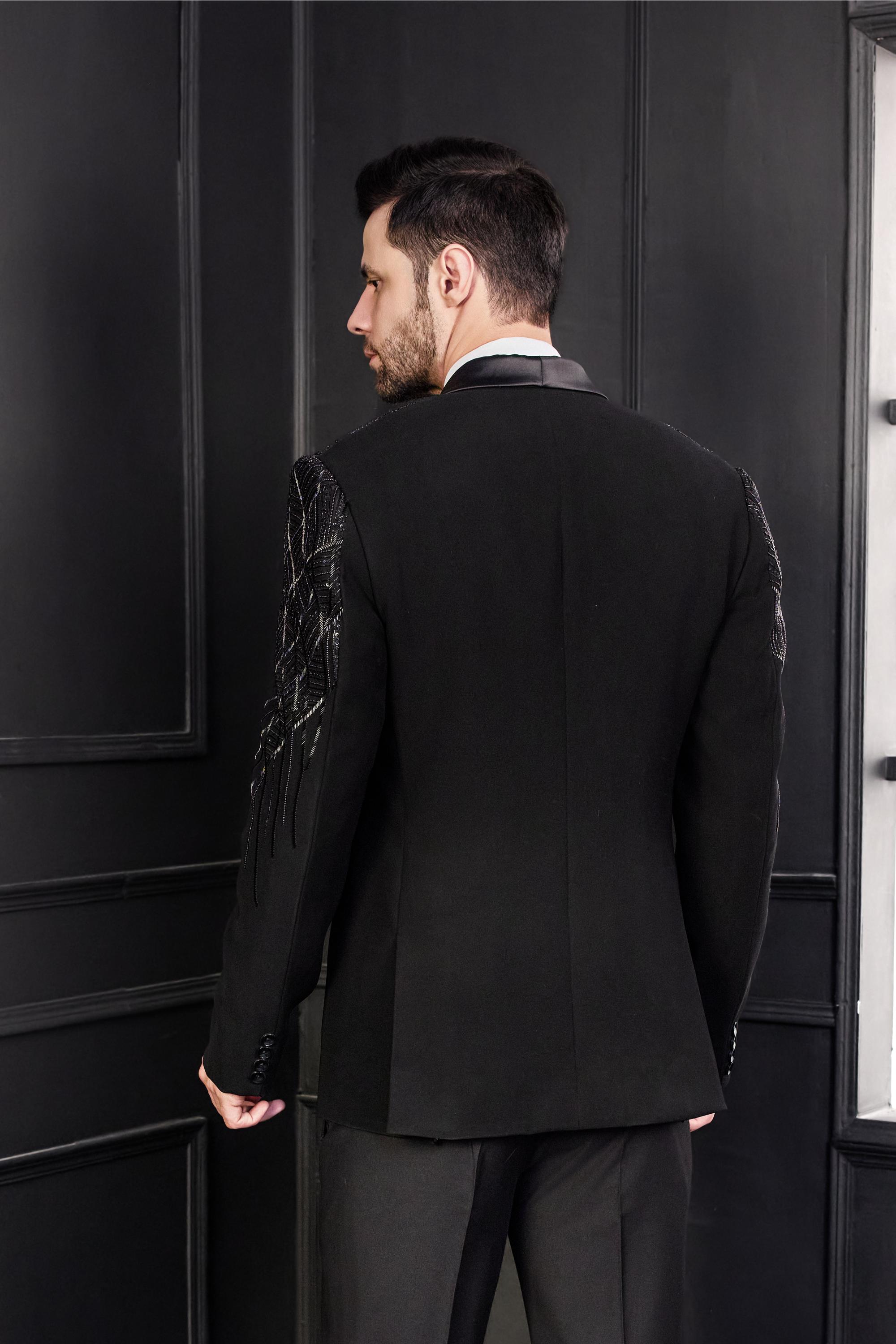 The Black Katdana Embroidery Tuxedo is a masterpiece in refined eveningwear, blending classic sophistication with artisanal detail. Adorned with intricate hand-embroidered katdana work, this tuxedo offers a subtle shimmer and texture that elevates its timeless black silhouette. Ideal for receptions, black-tie events, or festive celebrations, it’s designed for the modern gentleman who values craftsmanship, elegance, and a statement that speaks through detail.