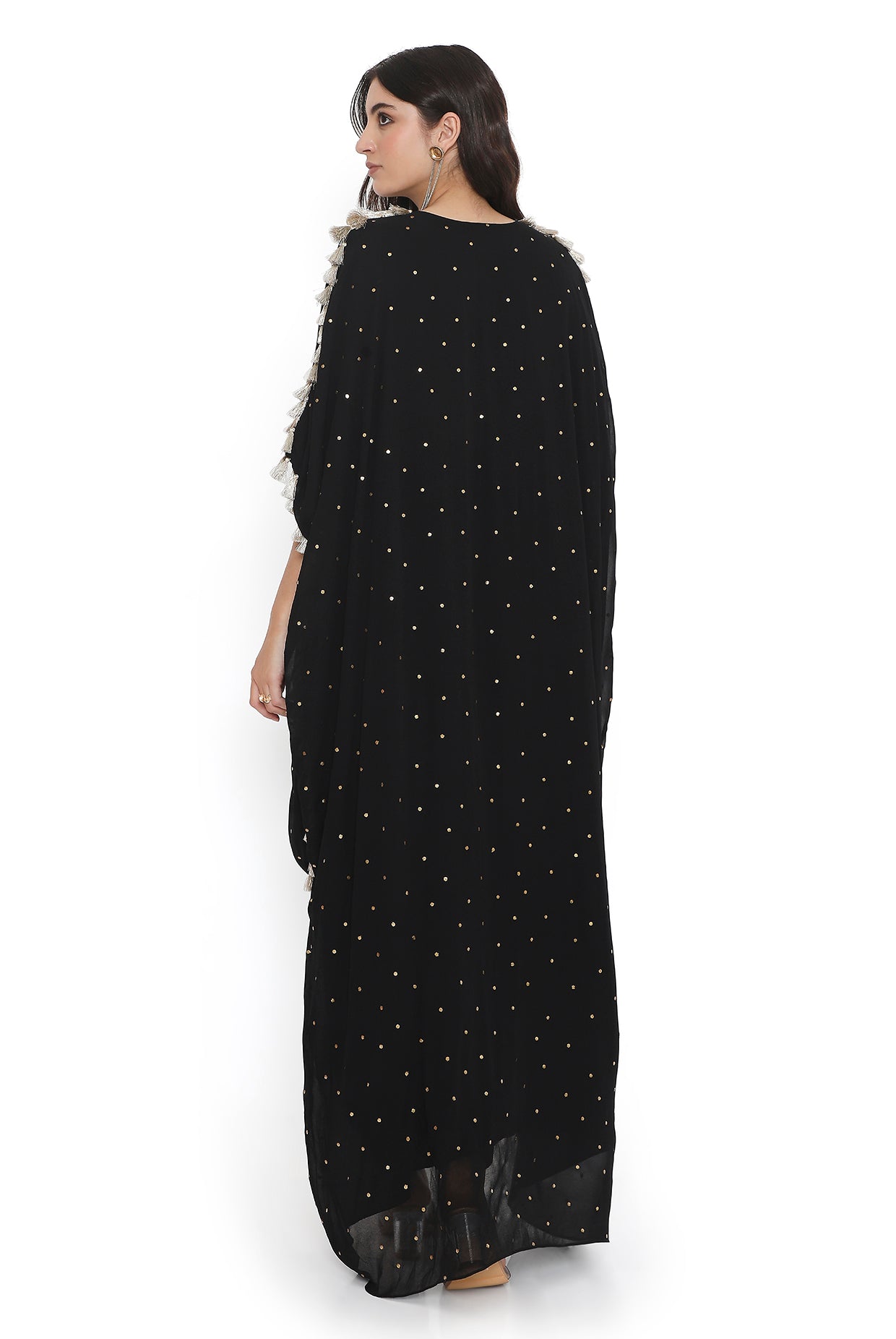 Discover the epitome of modern elegance with our Black Heavy Dot Mukaish Georgette Embroidered High-Low Kaftan. This sophisticated piece is adorned with intricate mukaish embroidery, creating a stunning contrast against the deep black georgette fabric. The high-low hemline adds a dramatic flair, while the luxurious jogger pant offers both comfort and style. Perfect for evening events or special occasions, this kaftan effortlessly blends traditional craftsmanship with contemporary design, ensuring you stand out with grace and sophistication.
