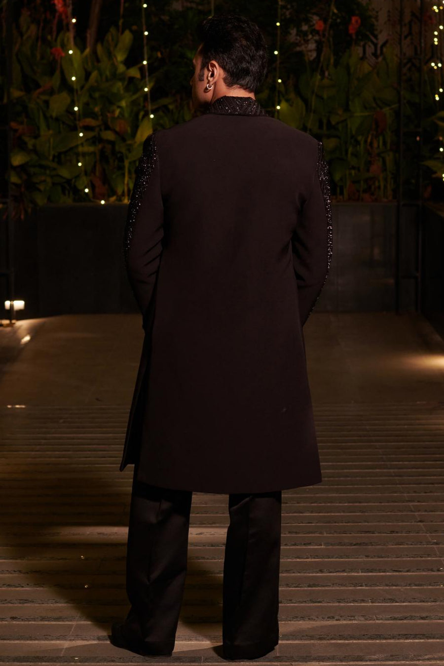 This black embroidered hitch kurta set is designed for the modern man with a taste for timeless style. The open-front jacket adorned with intricate handwork complements the structured kurta and tailored pants creating a sleek and polished look.
