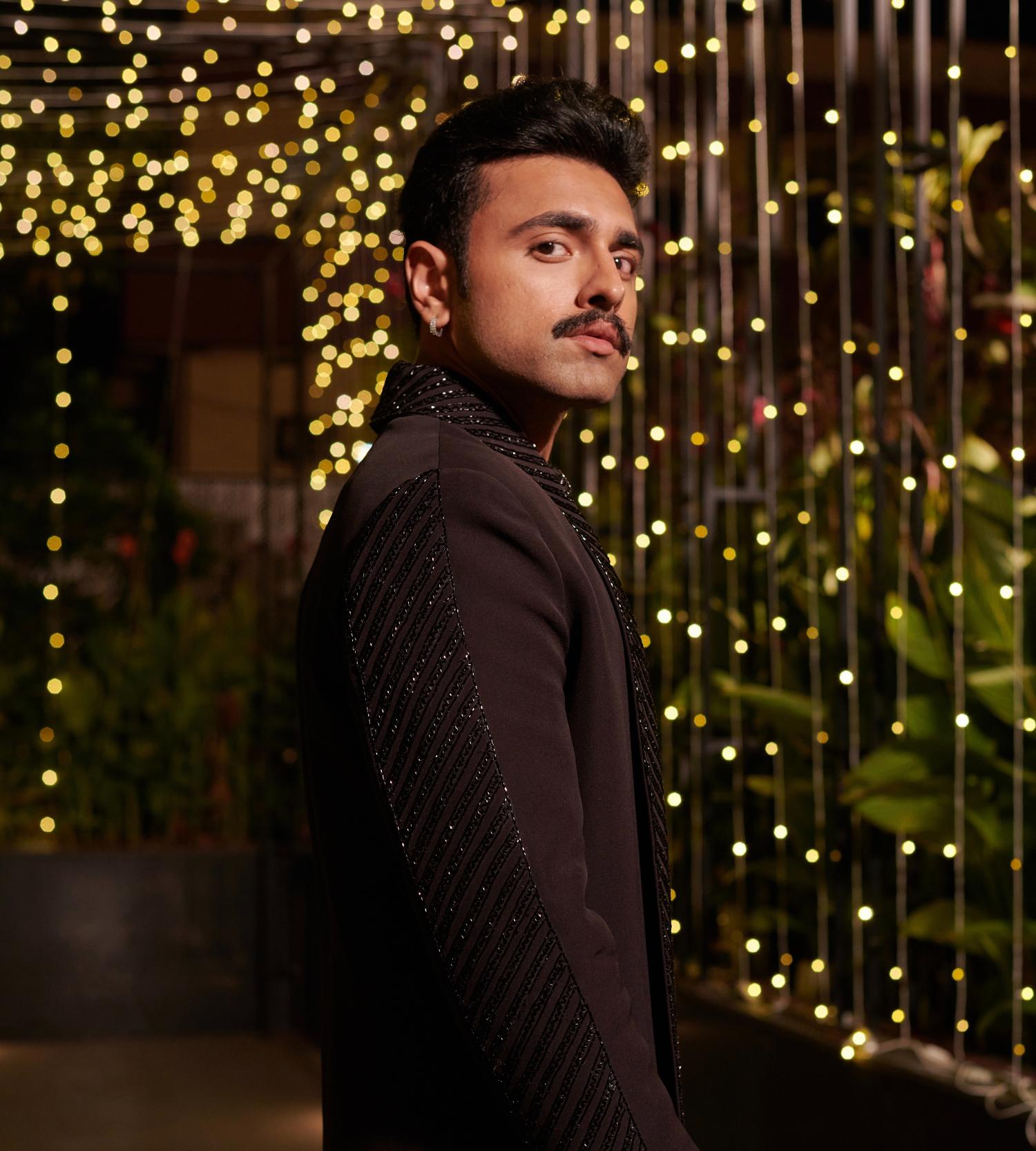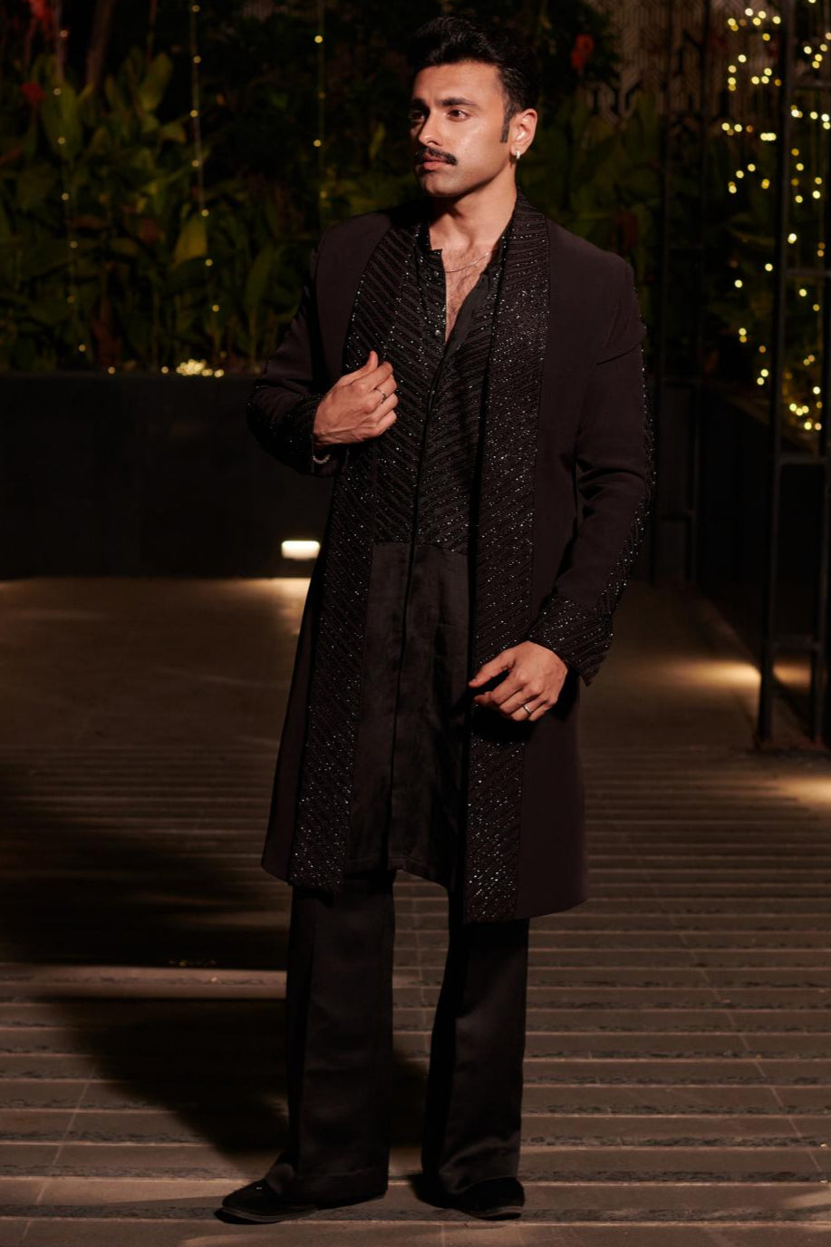 This black embroidered hitch kurta set is designed for the modern man with a taste for timeless style. The open-front jacket, adorned with intricate handwork, complements the structured kurta and tailored pants, creating a sleek and polished look.