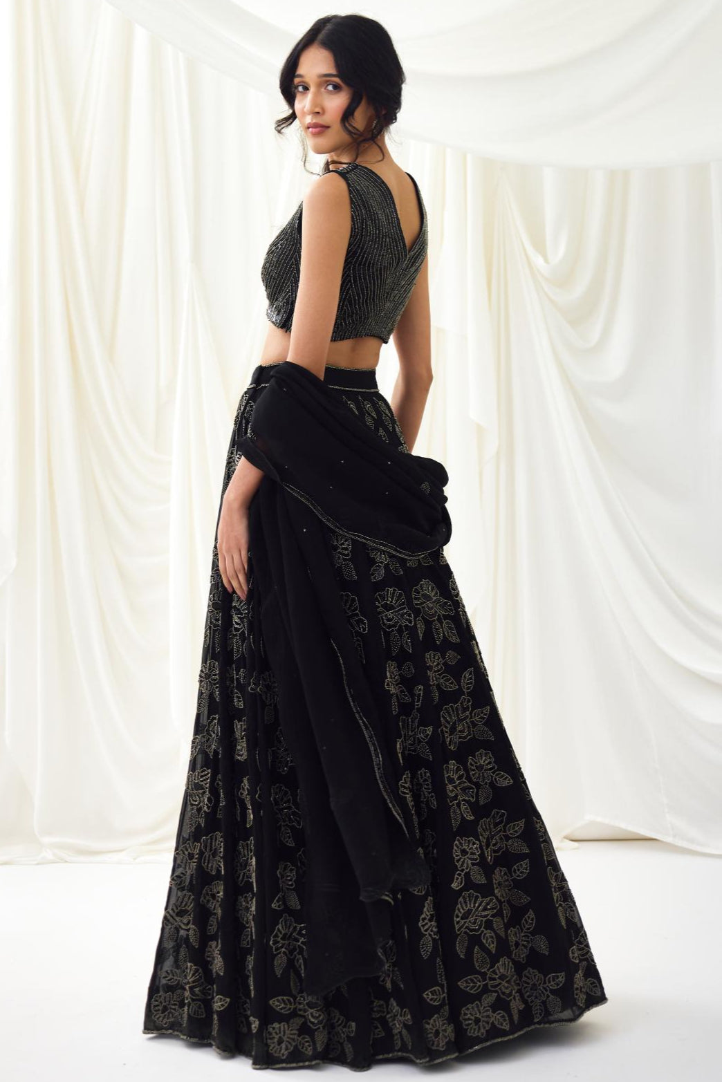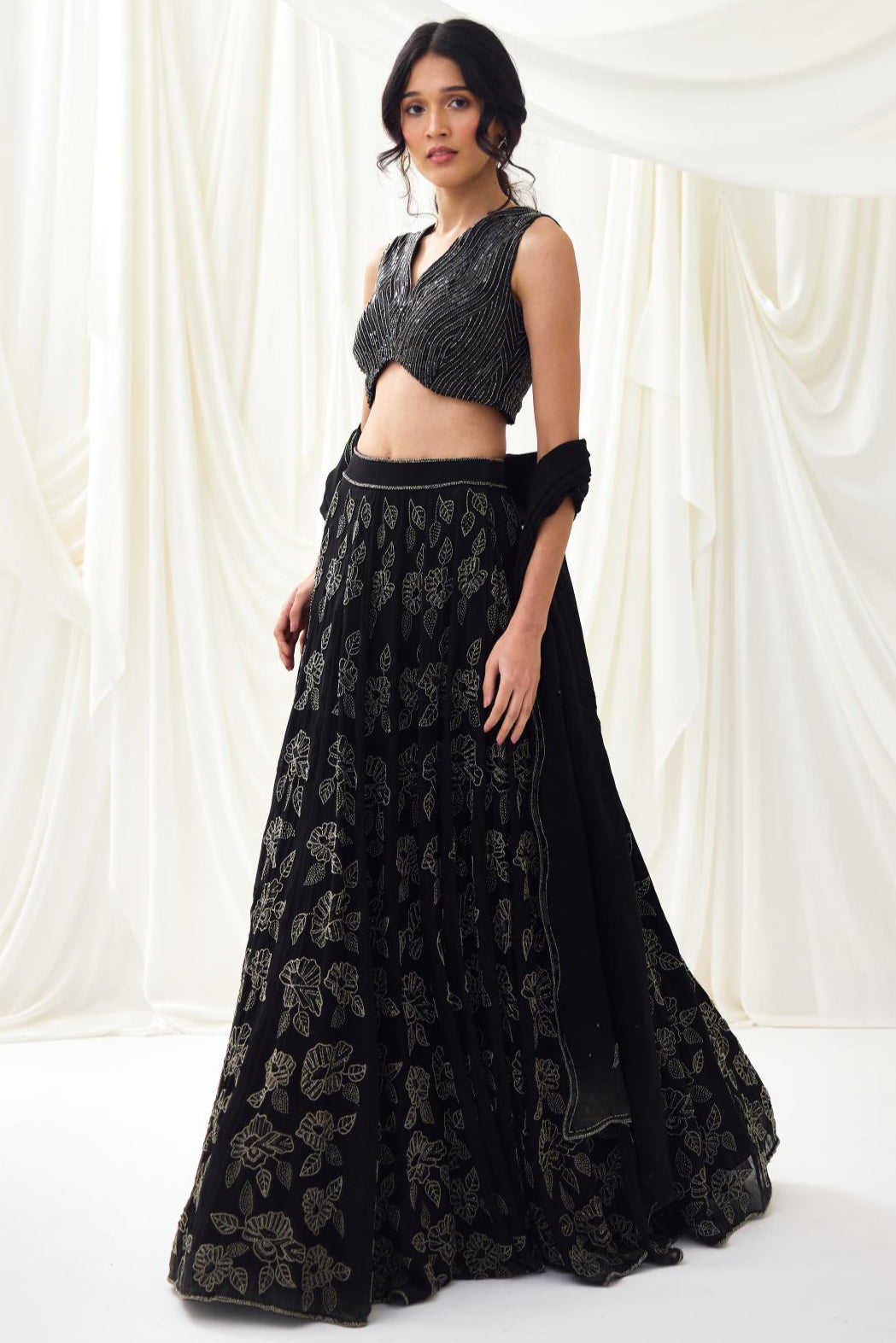Channel celestial elegance in our Nocturnes Lehenga Set in Black. This ethereal ensemble features a panelled organza skirt adorned with oxidized silver and black sequin embroidery. Paired with our signature beaded wave blouse and a delicately embellished organza dupatta with wavy edges, itÕs a masterpiece of moonlit glamour.