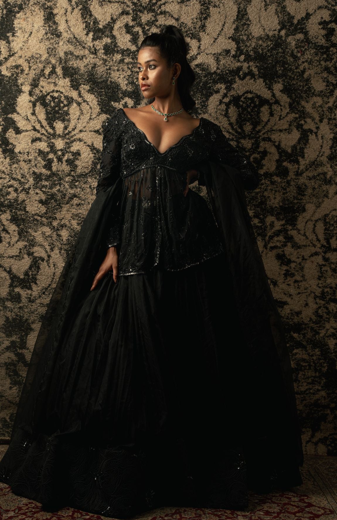 This black kurta set epitomizes graceful elegance with its exquisite design and attention to detail. The kurta crafted in classic black is adorned with intricate thread and kad dana tonal embroidery adding a touch of sophistication and charm. Paired with a flowing organza skirt the ensemble exudes ethereal beauty while the organza peplum adds a modern twist with its delicate draping and embroidery. Together these elements create a harmonious ensemble that seamlessly blends tradition with contemporary style perfect for making a statement at any special occasion.