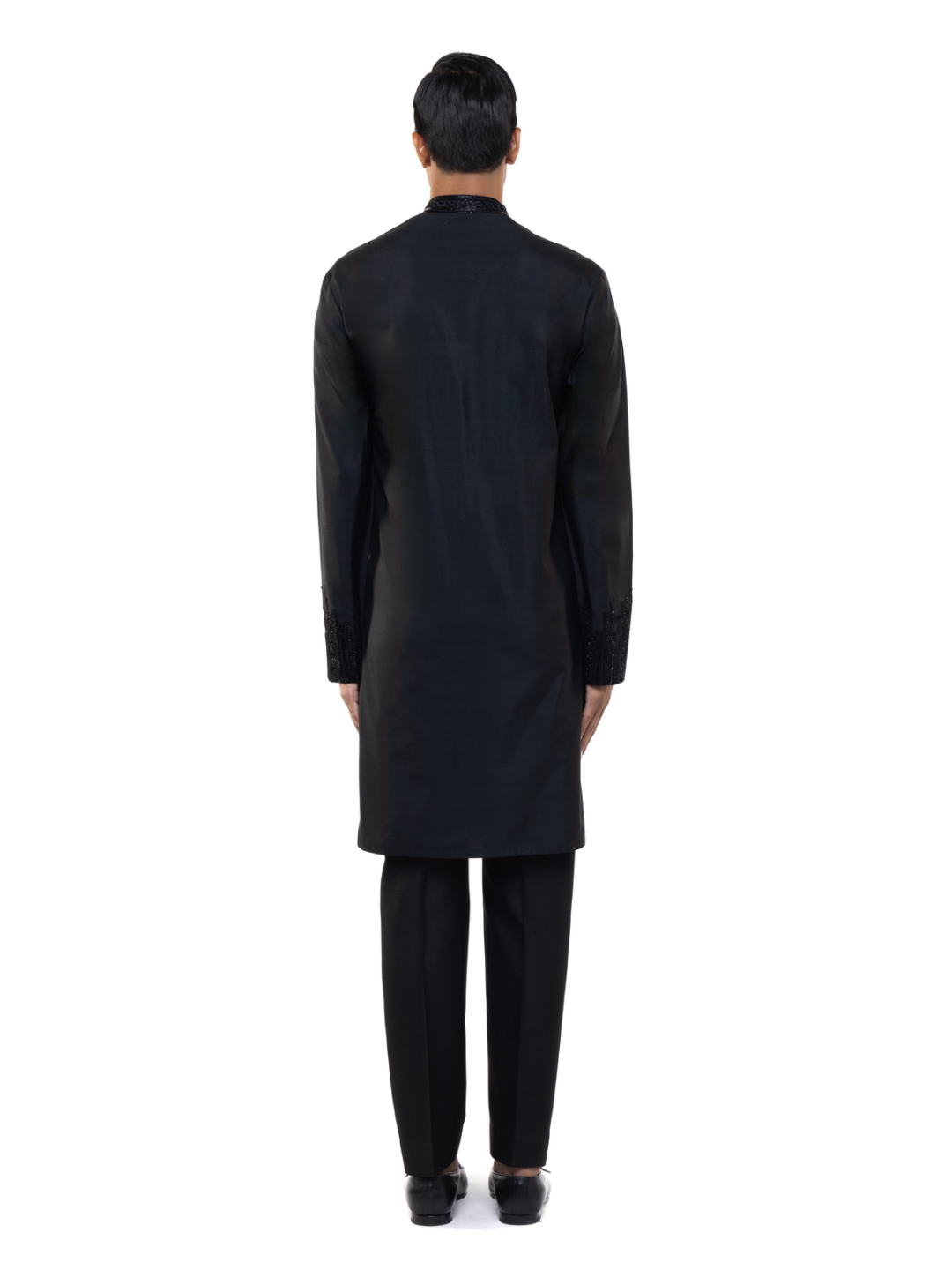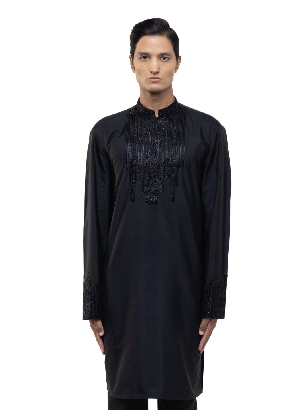 Elegant and timeless, this Black Embroidered Placket Kurta Set is crafted from luxurious silk and features intricate embroidery along the concealed placket for a sophisticated touch. Designed with a stand collar, Mother of Pearl buttons, and a straight hem, it offers a sleek and polished silhouette. The regular fit ensures comfort, making it an ideal choice for formal occasions, celebrations, or stylish gatherings.