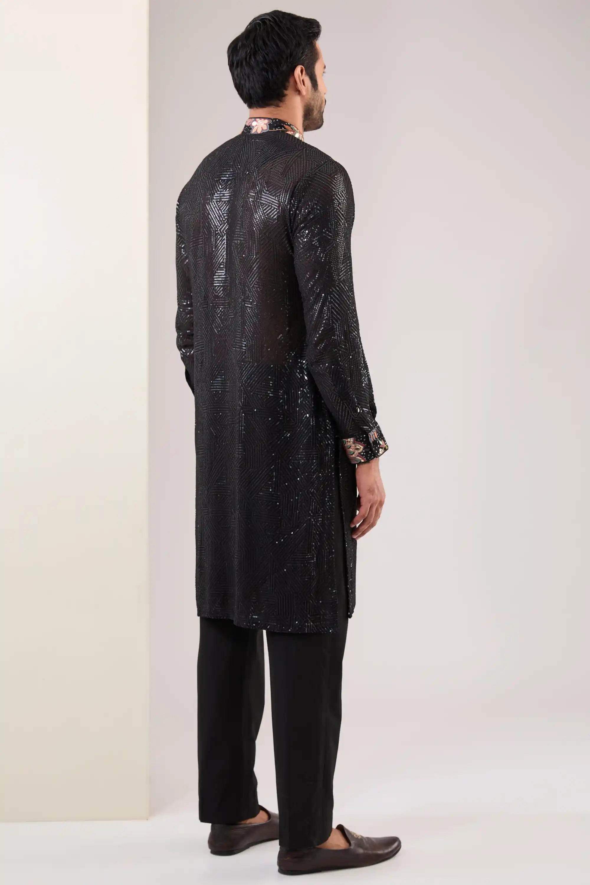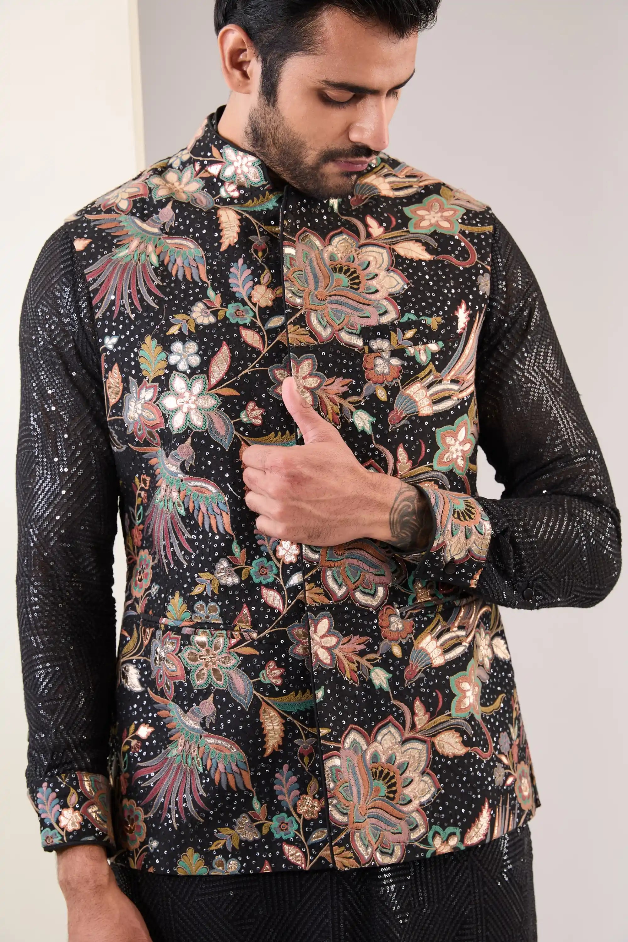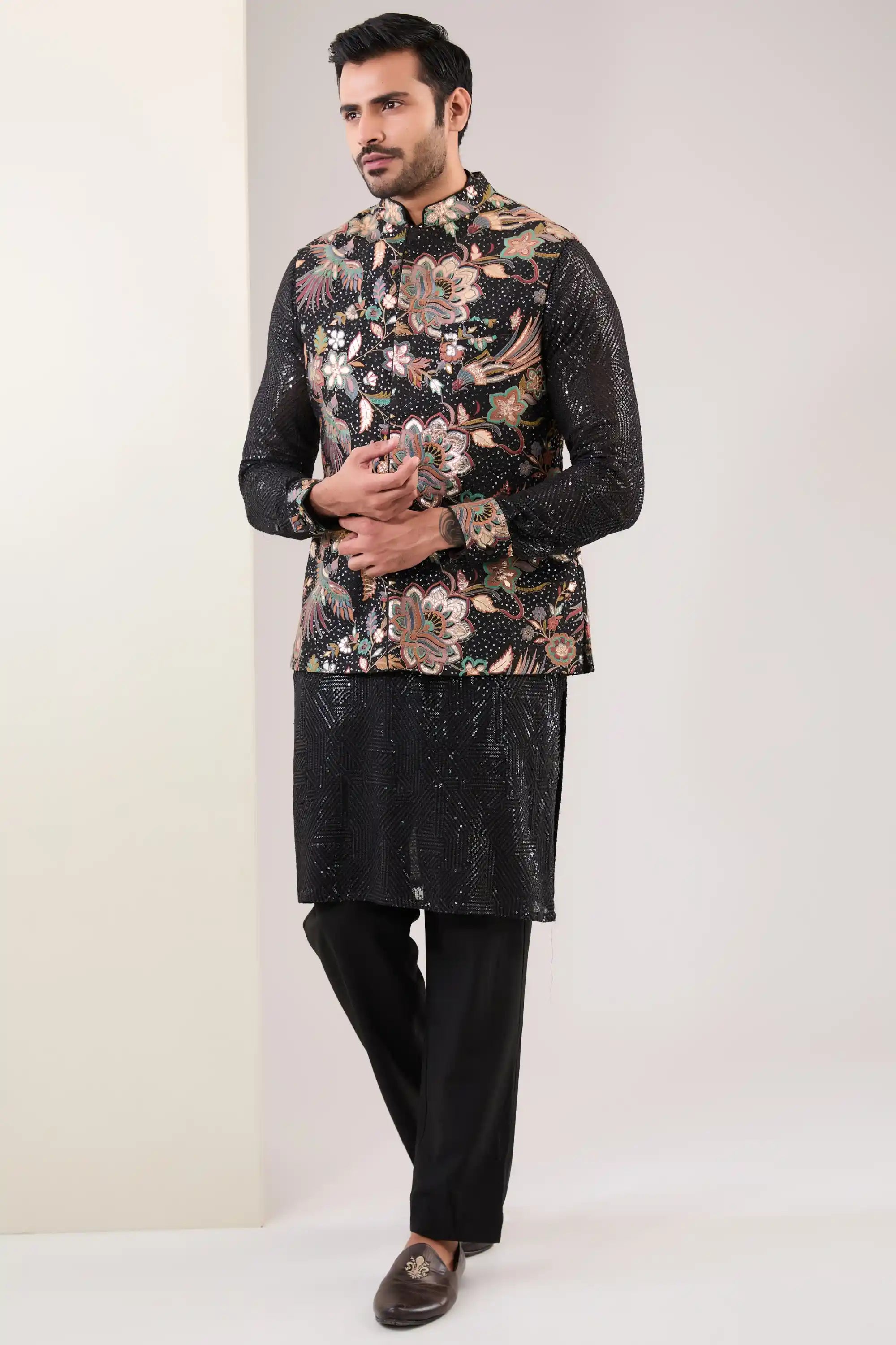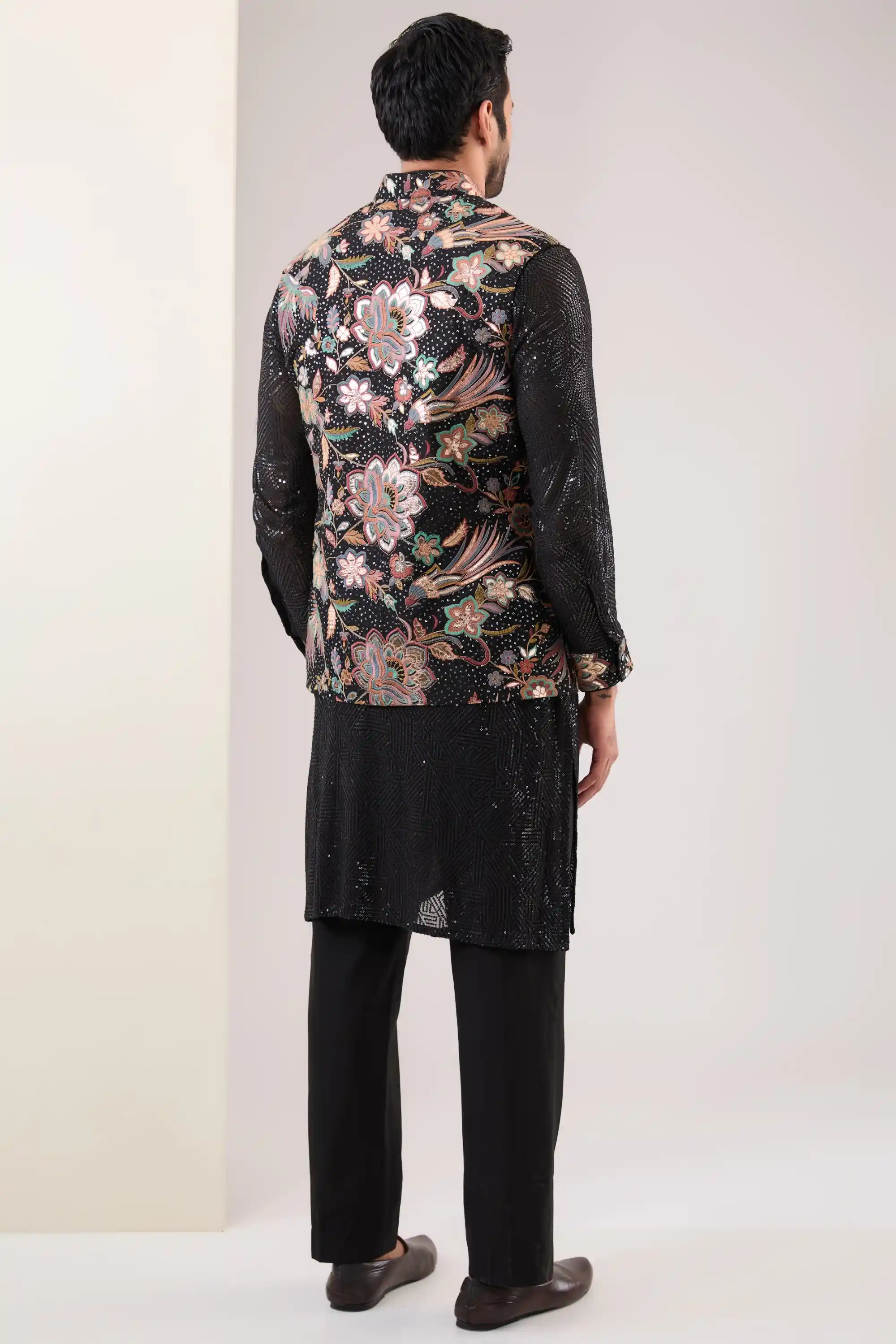 Elevate your elegance with this striking black silk bundi, adorned with intricate multi-thread and metal embroidery, complemented by tonal sequin detailing. Paired with a coordinating georgette kurta featuring embroidered cuffs, collar, and detailed slits, this ensemble is perfect for formal occasions. Complete with matching pants, it beautifully blends traditional craftsmanship with modern sophistication.