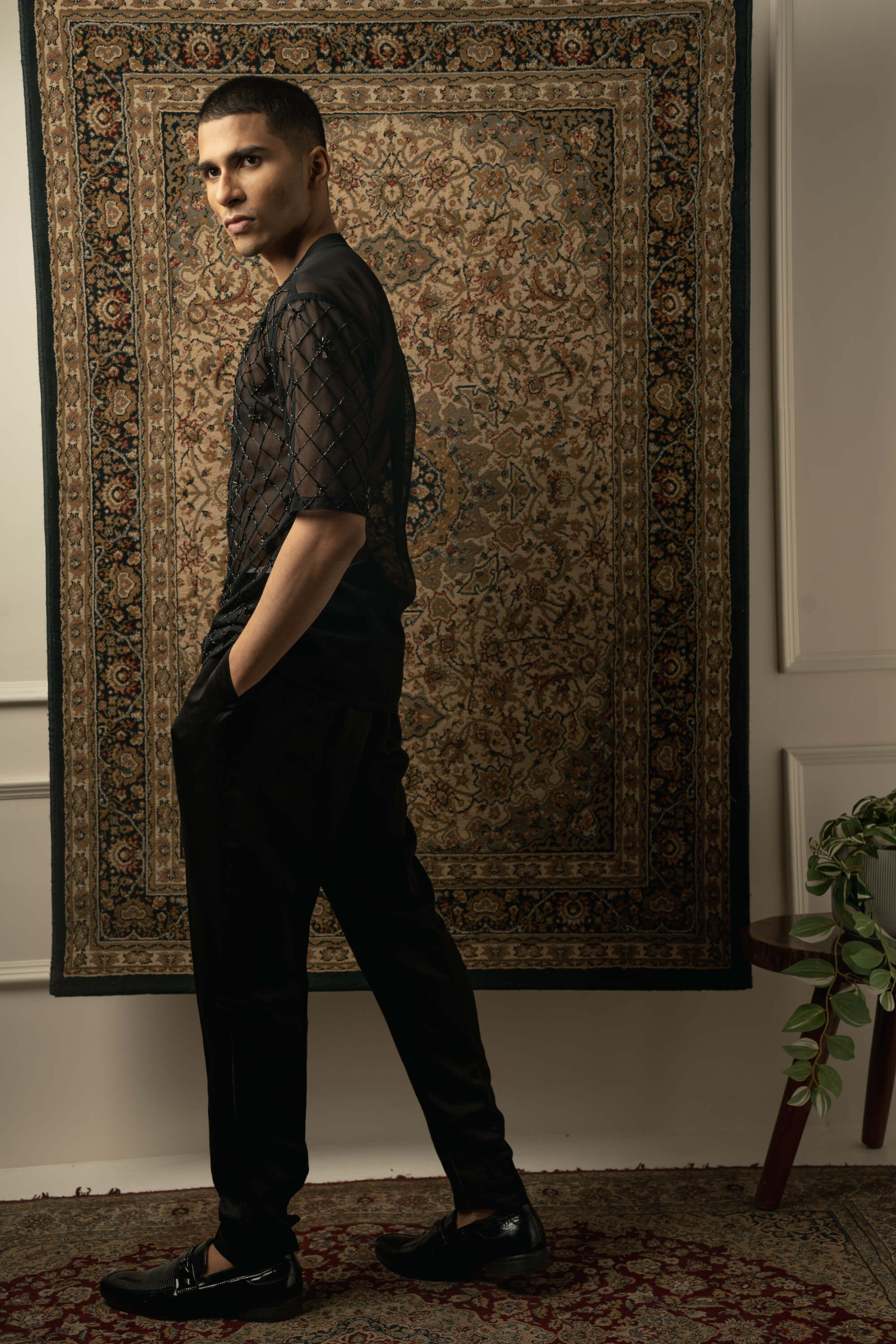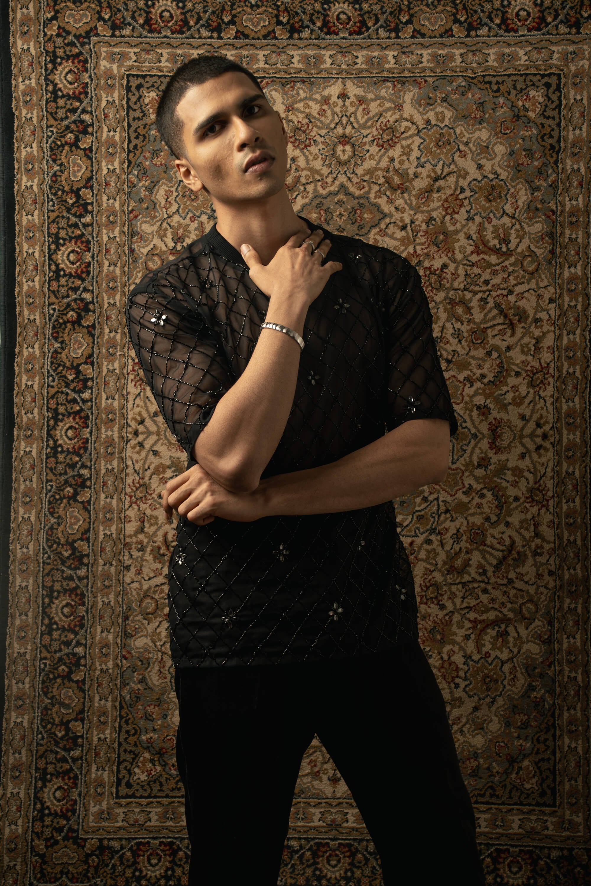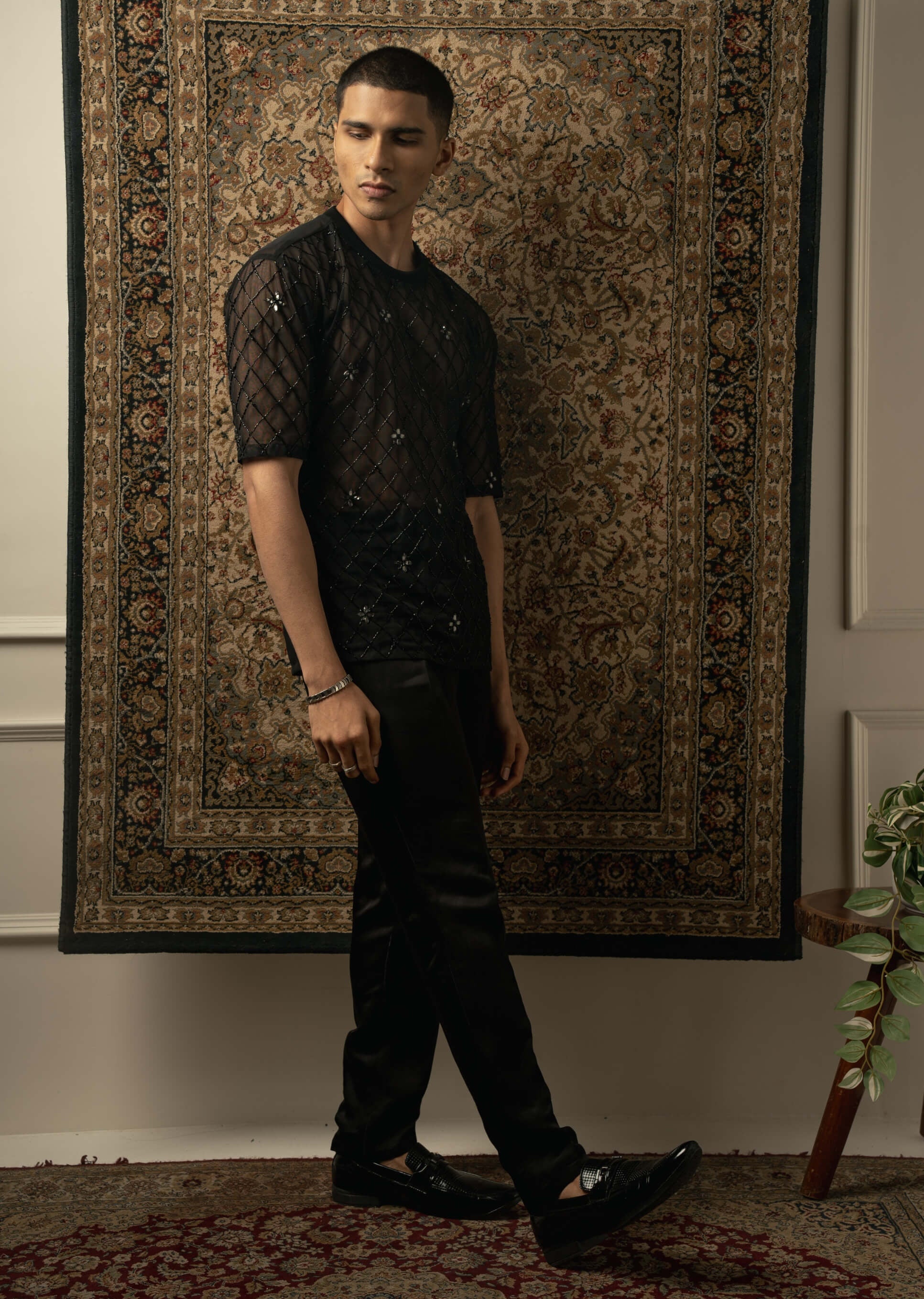 This black set exudes classic sophistication and elegance featuring a t-shirt made from fine net fabric with tonal hand embroidery for a touch of luxury. Balancing ruggedness with refinement this ensemble is perfect for those who want to make a bold statement with a hint of rebellion. Ideal for any occasion it stands out with its unique blend of style and class.