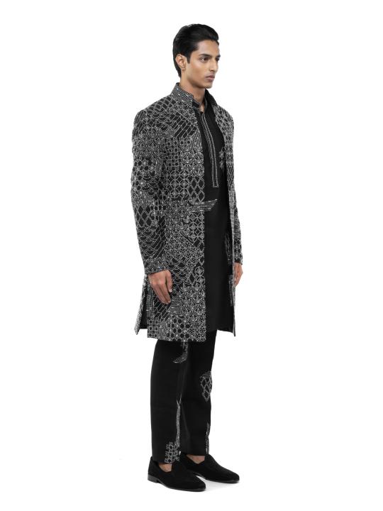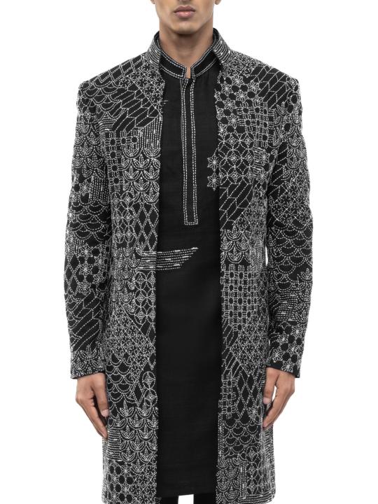 Chic and contemporary, this Black Linen Thread Embroidery Open Sherwani Set blends comfort with style. Crafted from breathable linen, it features elegant thread embroidery and an open placket design for a modern twist. Accented with Mother of Pearl buttons, a stand collar, and a straight hem, the regular fit ensures a relaxed yet polished silhouette-perfect for casual weddings, festive gatherings, and stylish events.