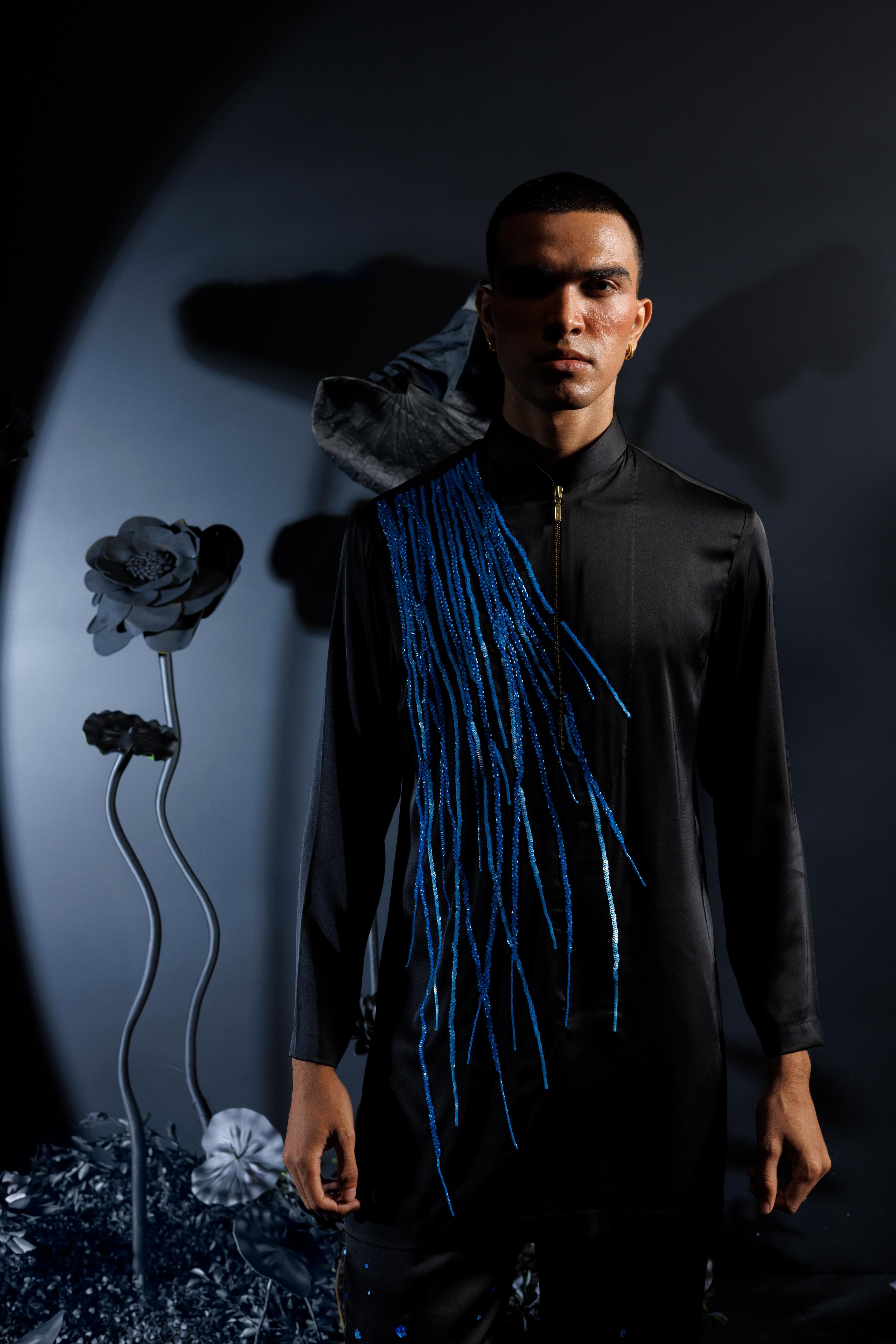 The Feather of Phoenix black satin kurta from Nautanky features intricate embroidery and galaxy-inspired embellished flowing tails. Perfect for wedding receptions, red carpet events, or upscale cocktail parties, this luxurious piece exudes sophistication and drama. The celestial design, paired with matching pants, makes it an ideal choice for evening events that demand bold elegance and timeless style.