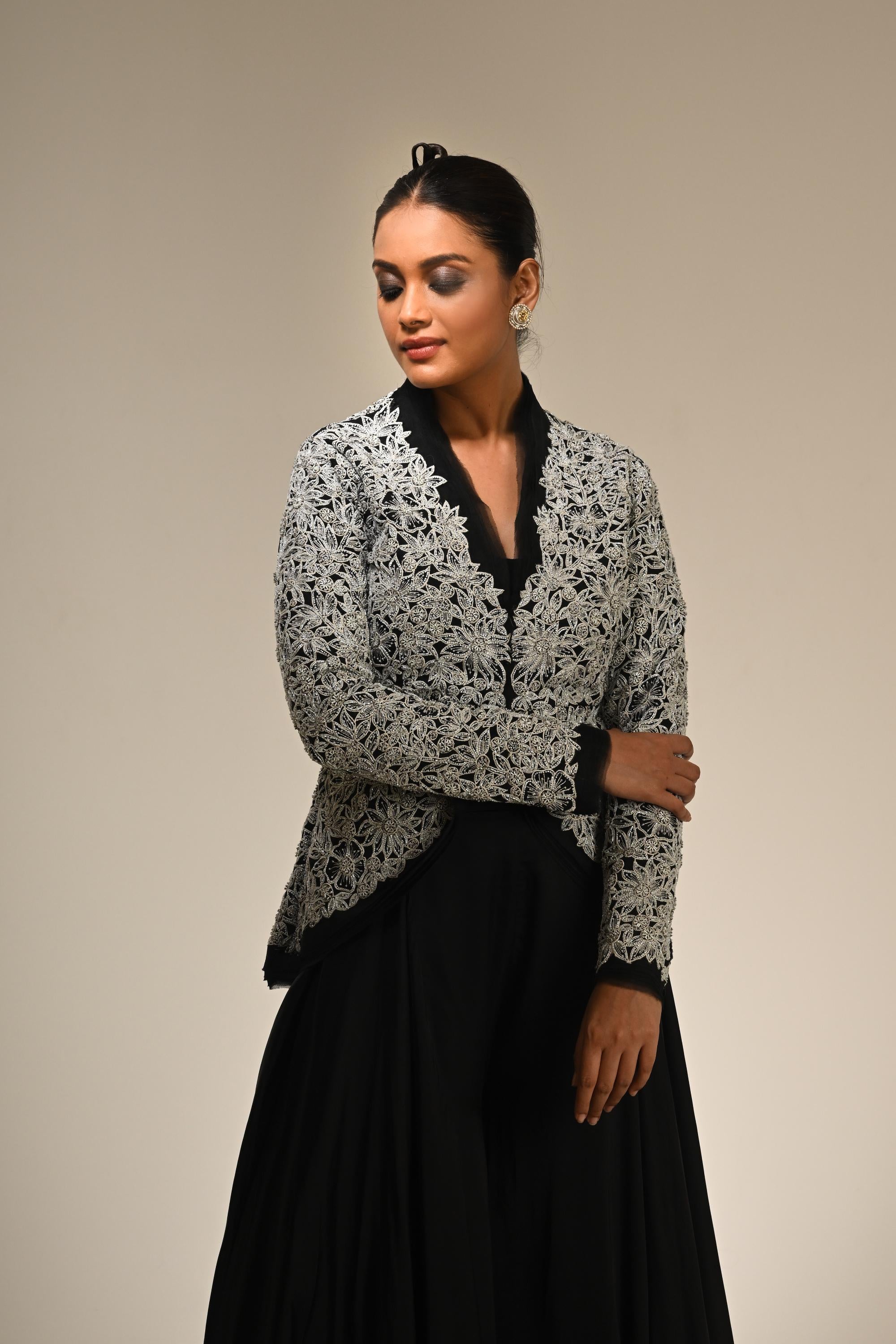 Bold and refined, the Black Floral Cutwork Jacket Set is a striking fusion of structure and softness. Featuring intricate floral cutwork on a sheer, statement jacket, this ensemble blends contemporary tailoring with timeless embroidery. The inner set offers a clean, minimalist base, allowing the jacket’s artistry to take center stage. Crafted in classic black, this look is perfect for cocktail evenings, festive celebrations, or modern wedding functions. The Black Floral Cutwork Jacket Set is a power piece—elegant, versatile, and designed to leave a lasting impression.