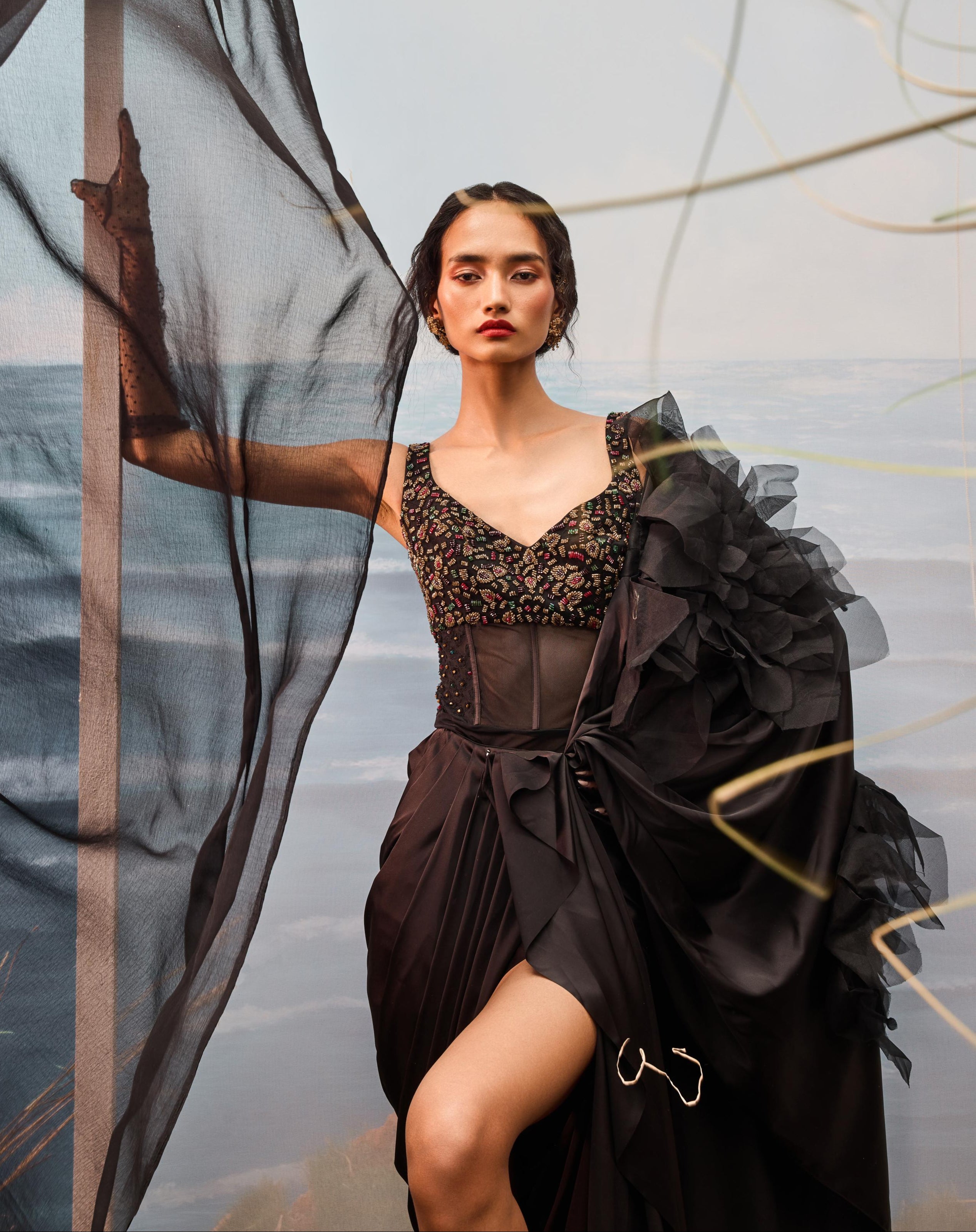 Elegant, bold, and uniquely modern, the Black Florentia Drape Sari with Bodysuit combines traditional allure with contemporary sophistication. The luxurious black fabric drapes beautifully, offering timeless grace, while the form-fitting bodysuit adds a modern twist and ensures comfort and ease. This ensemble is perfect for high-profile events, weddings, or formal occasions where you want to make a statement. For the woman who loves to merge classic style with a bold edge, this sari set is a show-stopping addition to any wardrobe.