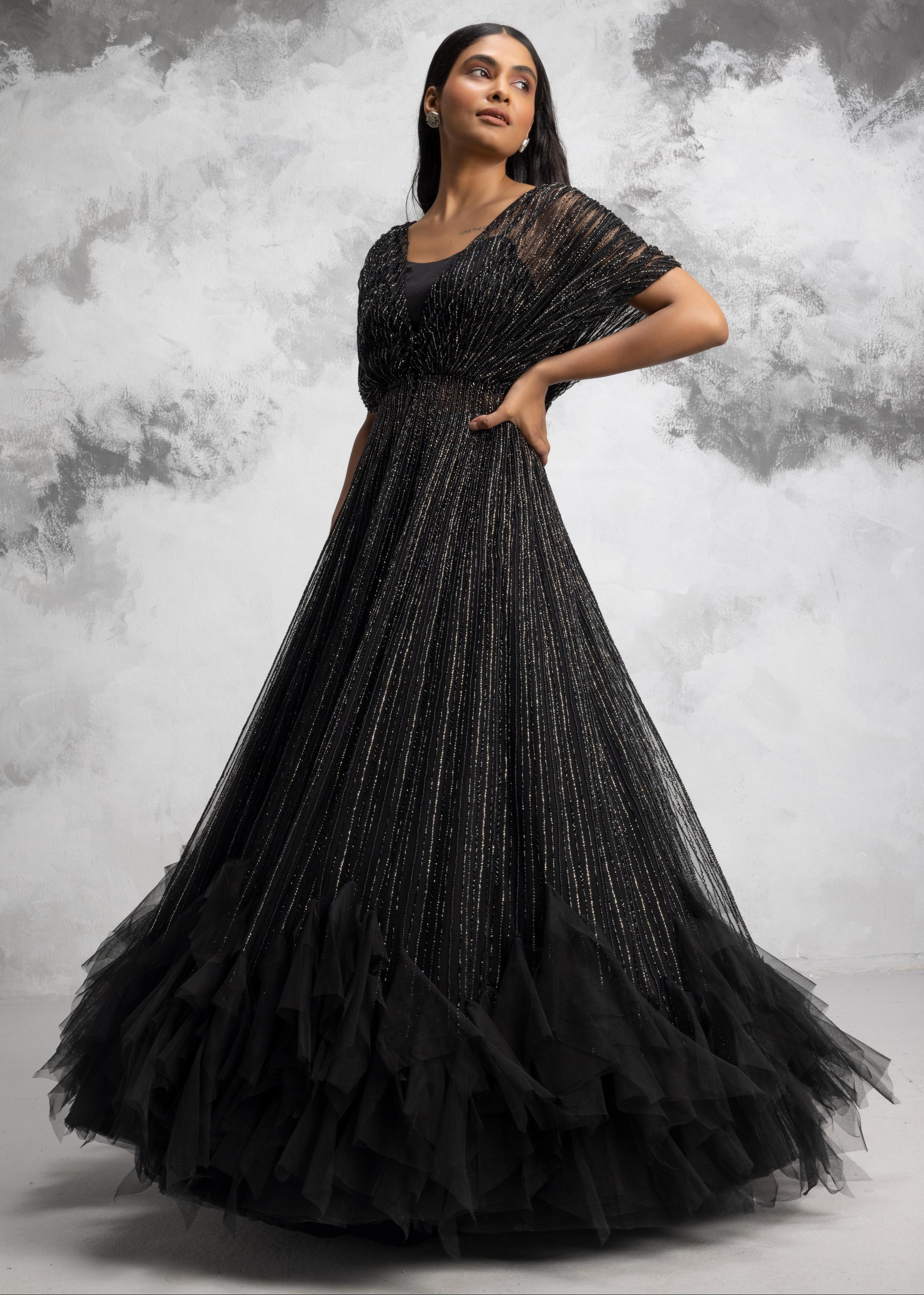 This flouncy gathered gown features parallel geometric lines of bugle beads running down the silhouette, adding texture and dimension. The gown is impeccably finished with raw net cutouts, creating an edgy yet elegant contrast. Perfect for high-end events, this outfit seamlessly blends intricate detailing with modern style, offering a striking, sophisticated look that commands attention.