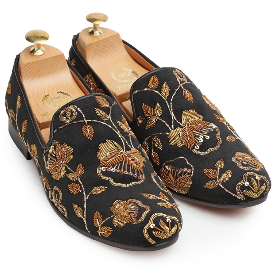 Step into luxury with the Black Golden Flora Slip-Ons, a masterpiece of intricate artistry and refined sophistication. Crafted from plush black velvet, these slip-ons feature exquisite gold floral embroidery, adding a regal touch to your ensemble. Designed for those who appreciate fine craftsmanship, they are the perfect choice for weddings, festive occasions, and elite gatherings.