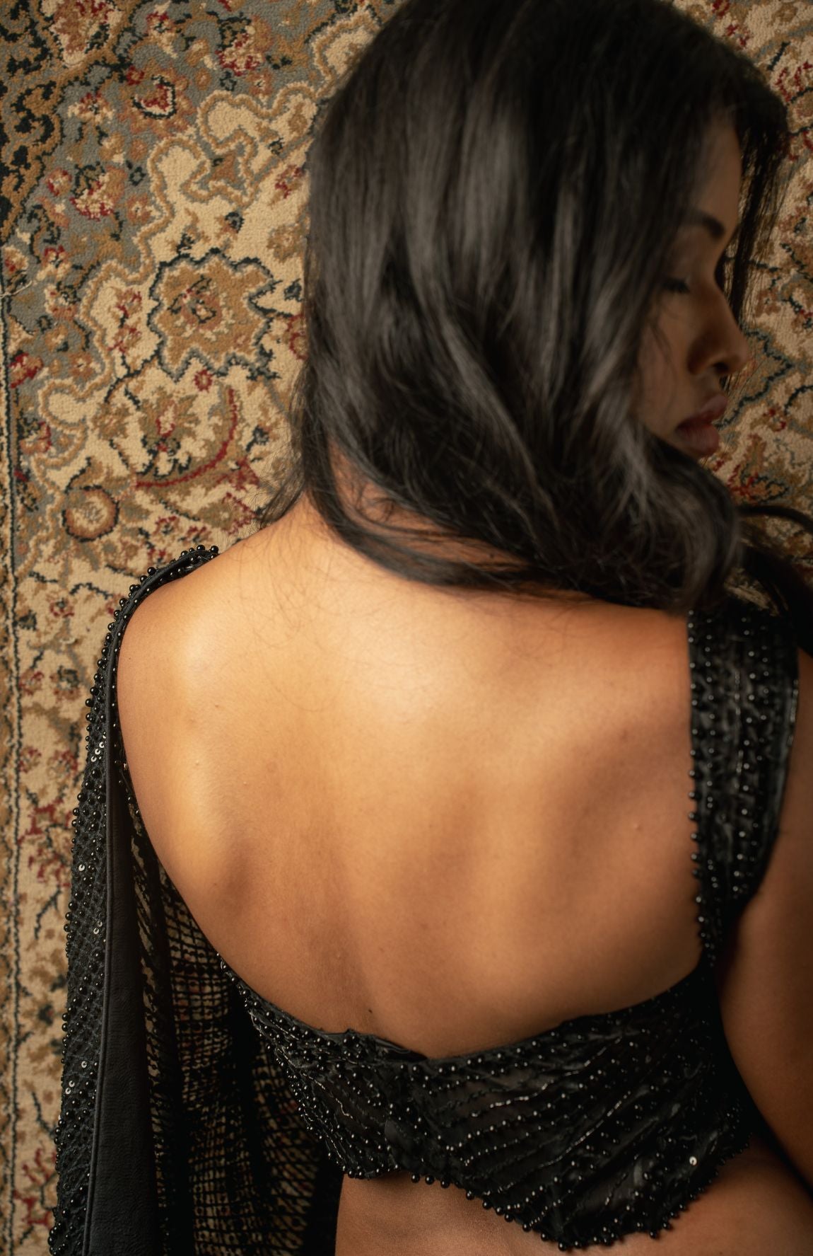 This stunning black saree epitomizes elegance and sophistication with its luxurious satin and georgette base. Adorned with exquisite thread and kad dana embroidery, it exudes opulence and grace with every drape. Paired perfectly with a black net corset blouse, the ensemble strikes a balance between traditional allure and contemporary chic. Synonymous with beauty, the corset blouse adds a touch of glamour and allure, completing the ensemble with a modern twist. This ensemble is a timeless choice for any occasion, radiating charm and confidence effortlessly.