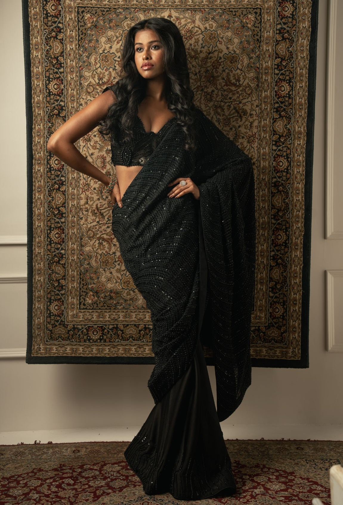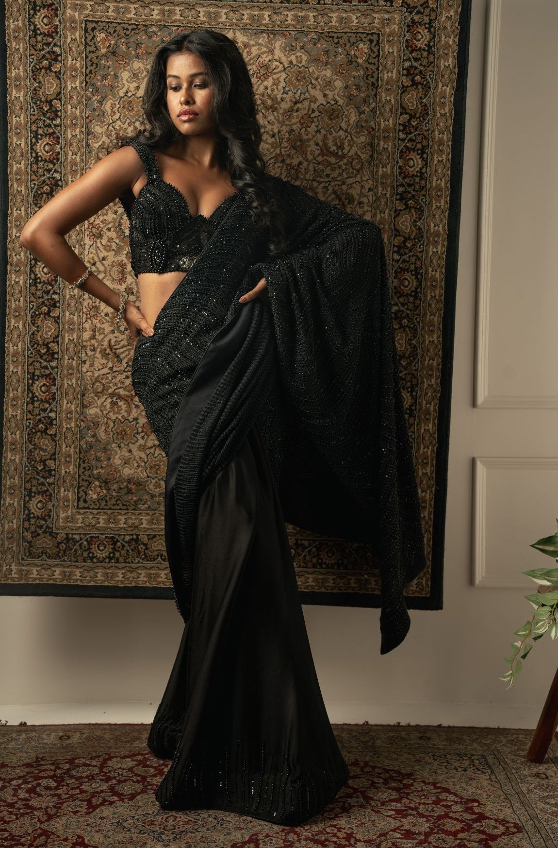 This stunning black saree epitomizes elegance and sophistication with its luxurious satin and georgette base. Adorned with exquisite thread and kad dana embroidery it exudes opulence and grace with every drape. Paired perfectly with a black net corset blouse the ensemble strikes a balance between traditional allure and contemporary chic. Synonymous with beauty the corset blouse adds a touch of glamour and allure completing the ensemble with a modern twist. This ensemble is a timeless choice for any occasion radiating charm and confidence effortlessly.