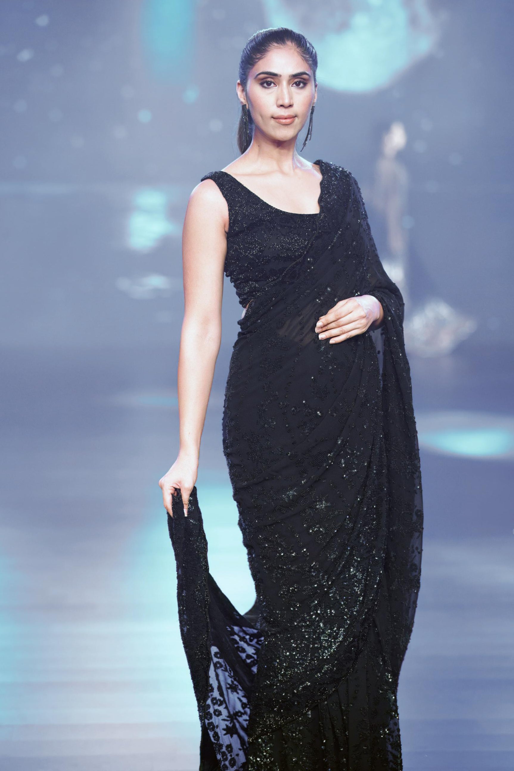 The Black G-60 Lehriya Jaal Saree Set is a stunning combination of traditional elegance and contemporary style. Featuring a striking Lehriya Jaal pattern, this saree is crafted from premium fabric, offering a graceful drape with a modern twist. The intricate design adds a vibrant touch to the deep black hue, making it perfect for weddings, receptions, or festive occasions. Paired with a matching blouse, this saree promises a timeless and sophisticated look, ensuring you make a bold yet elegant statement at any event.