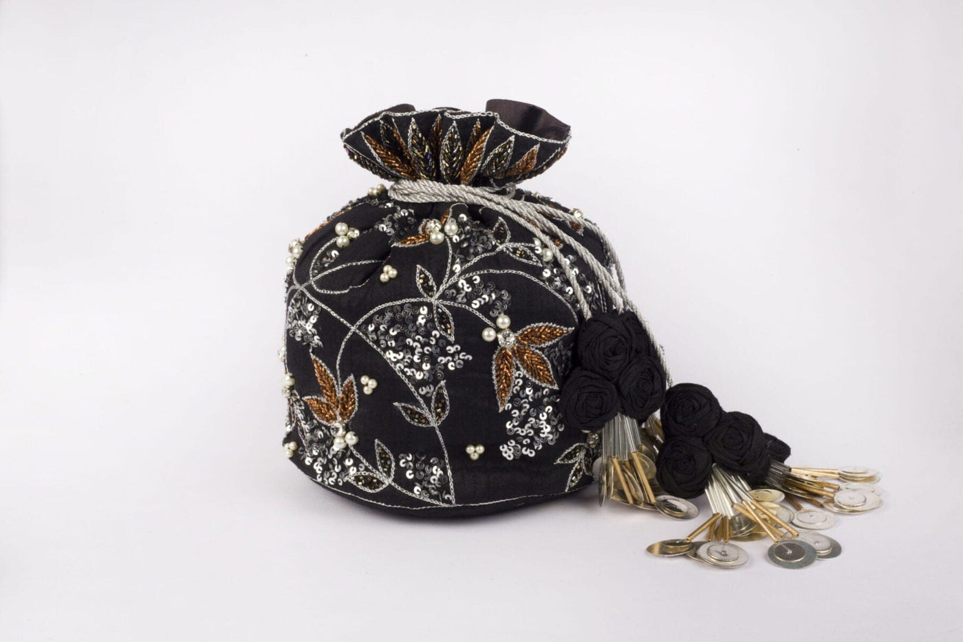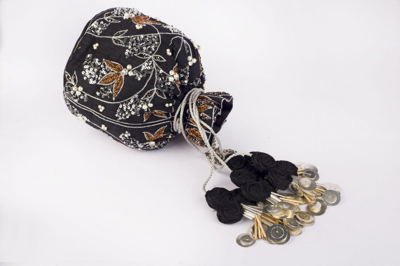This opulent Potli clutch features exquisite heavy embroidery with pearls, sequins, zardozi, and multicolored kath dana work, enhanced with a dazzling touch of Swarovski. The beautifully handcrafted flower tassels, the brandês signature USP, add a regal charm. A perfect statement accessory for weddings, festive occasions, and grand celebrations.
