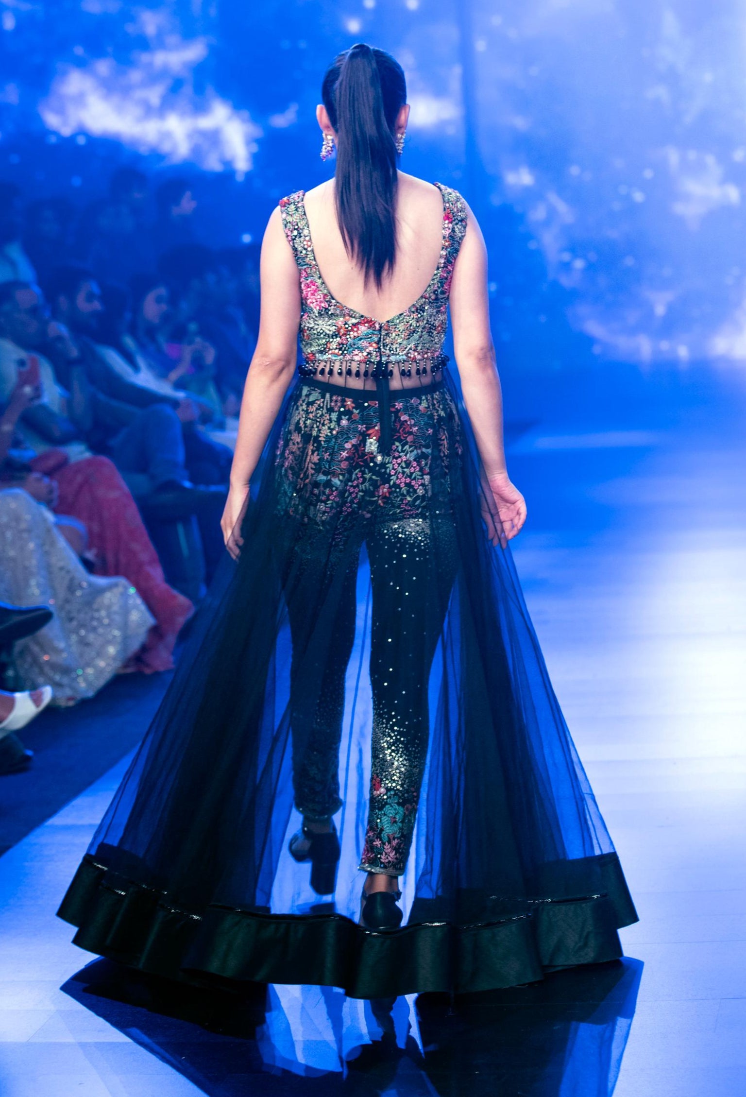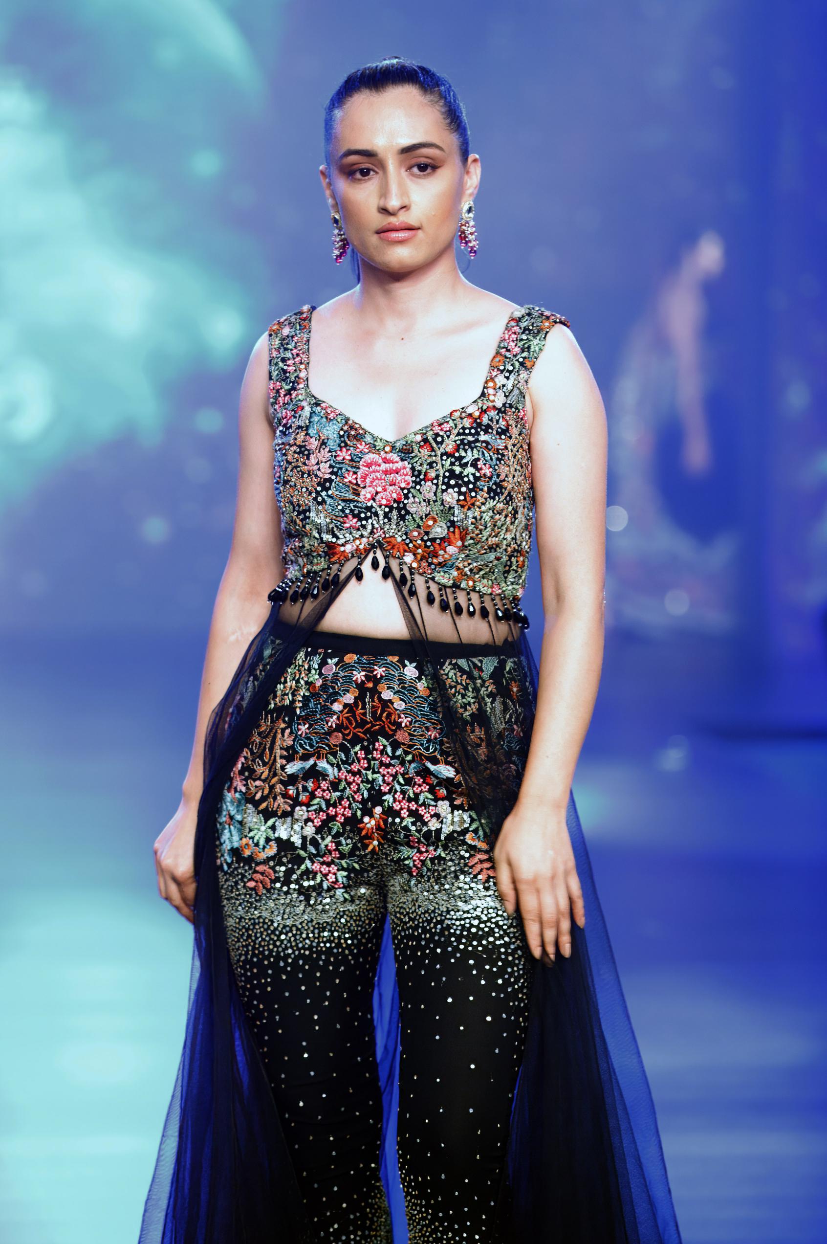 The Black Georgette Multi Resham and Sequin Embroidered Gown is a captivating blend of elegance and contemporary glamour. Crafted from luxurious black georgette, this gown features intricate multi-colored resham embroidery and sparkling sequin embellishments, adding texture and depth to the design. The flowing silhouette enhances its graceful appeal, making it perfect for evening galas, formal events, or special occasions. With its striking combination of intricate detailing and sophisticated style, this gown promises to make a bold yet elegant statement.