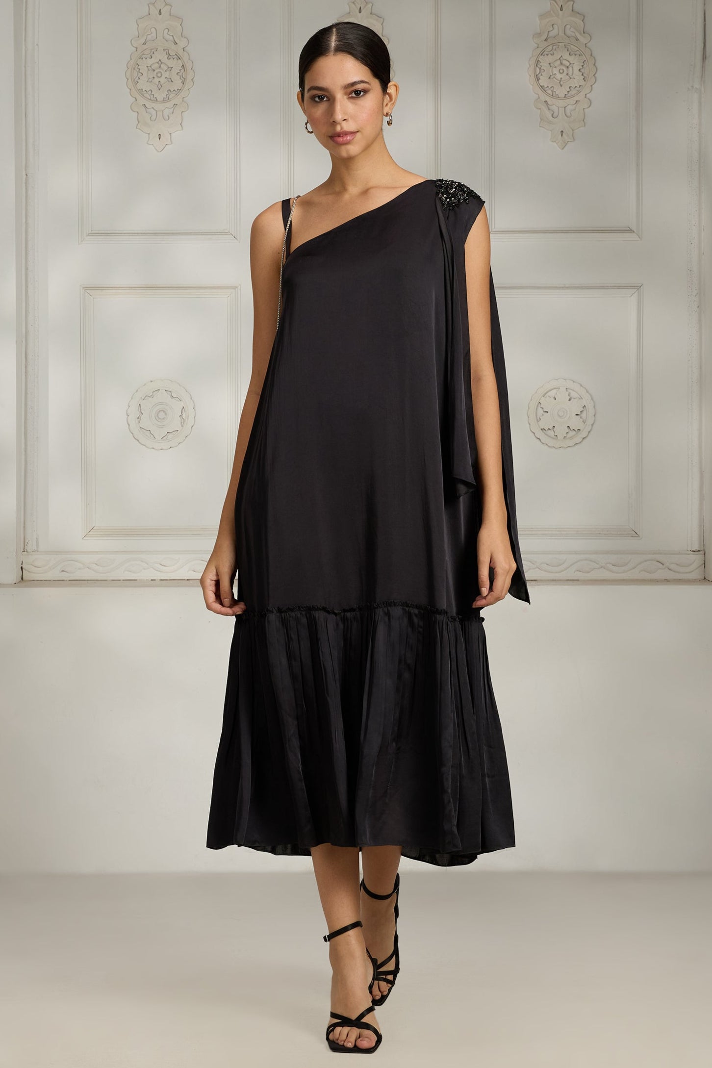 The Black One-Shoulder Dress is a sleek and modern piece that exudes effortless sophistication. With its asymmetrical neckline, it adds a bold and stylish twist to a classic silhouette. The single-shoulder design flatters the neckline and adds visual interest. Perfect for cocktail parties, dinners, or evening events. This dress is a timeless statement of contemporary elegance.
