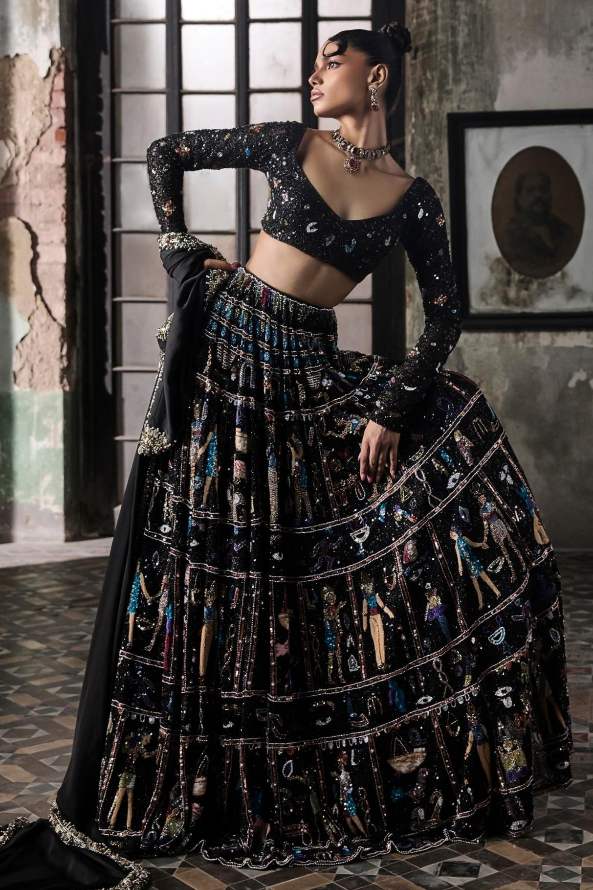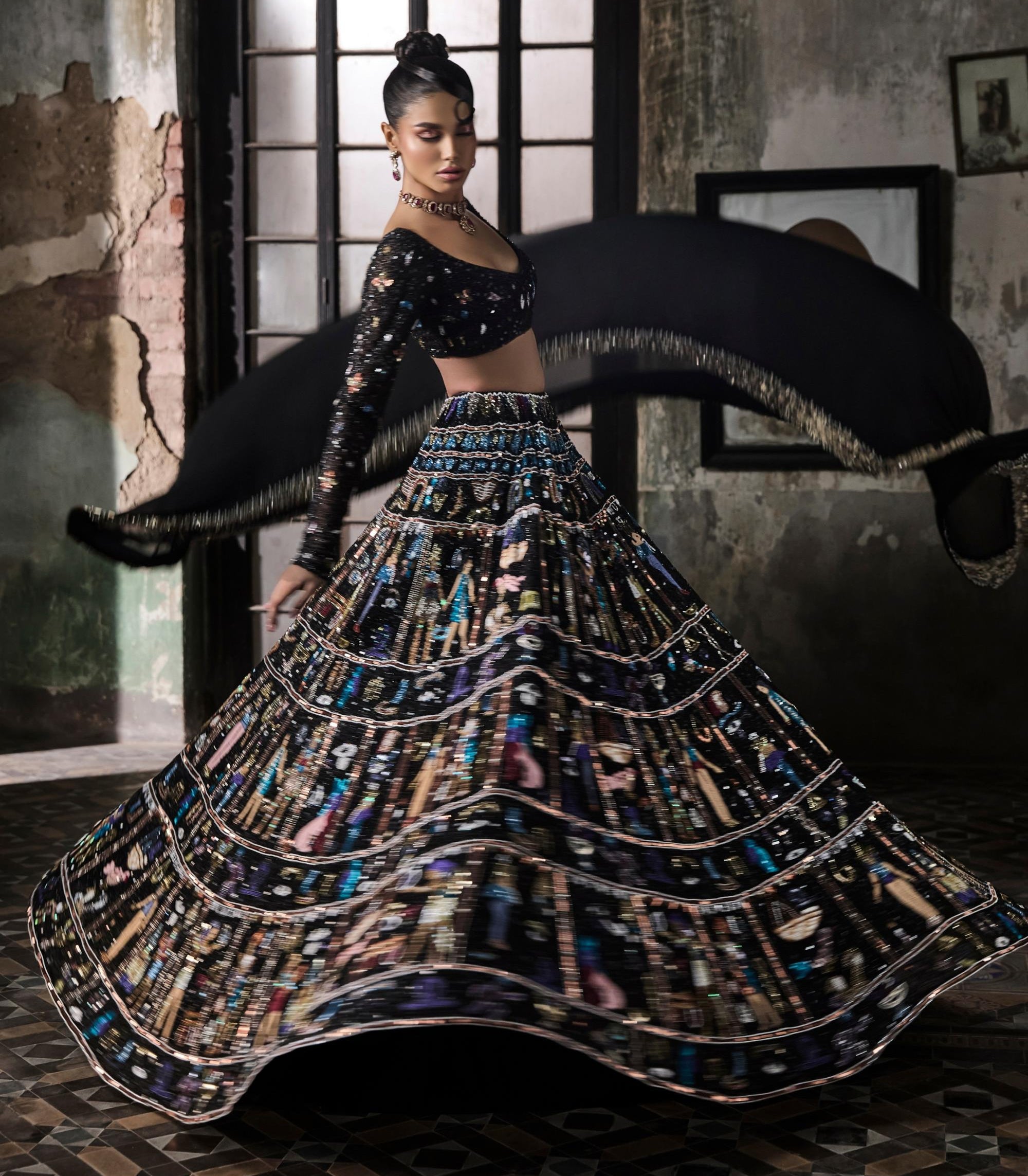 Elevate your eveningwear game with the Black Oraan Lehenga Set, a statement of modern sophistication and timeless allure. The rich black base is adorned with subtle embellishments and fluid silhouettes, exuding understated glam. Ideal for cocktail nights, receptions, or glam soirées, this ensemble fuses contemporary styling with classic charm. The set pairs effortlessly with bold makeup and statement jewelry. A must-have for those who dress to leave a lasting impression.