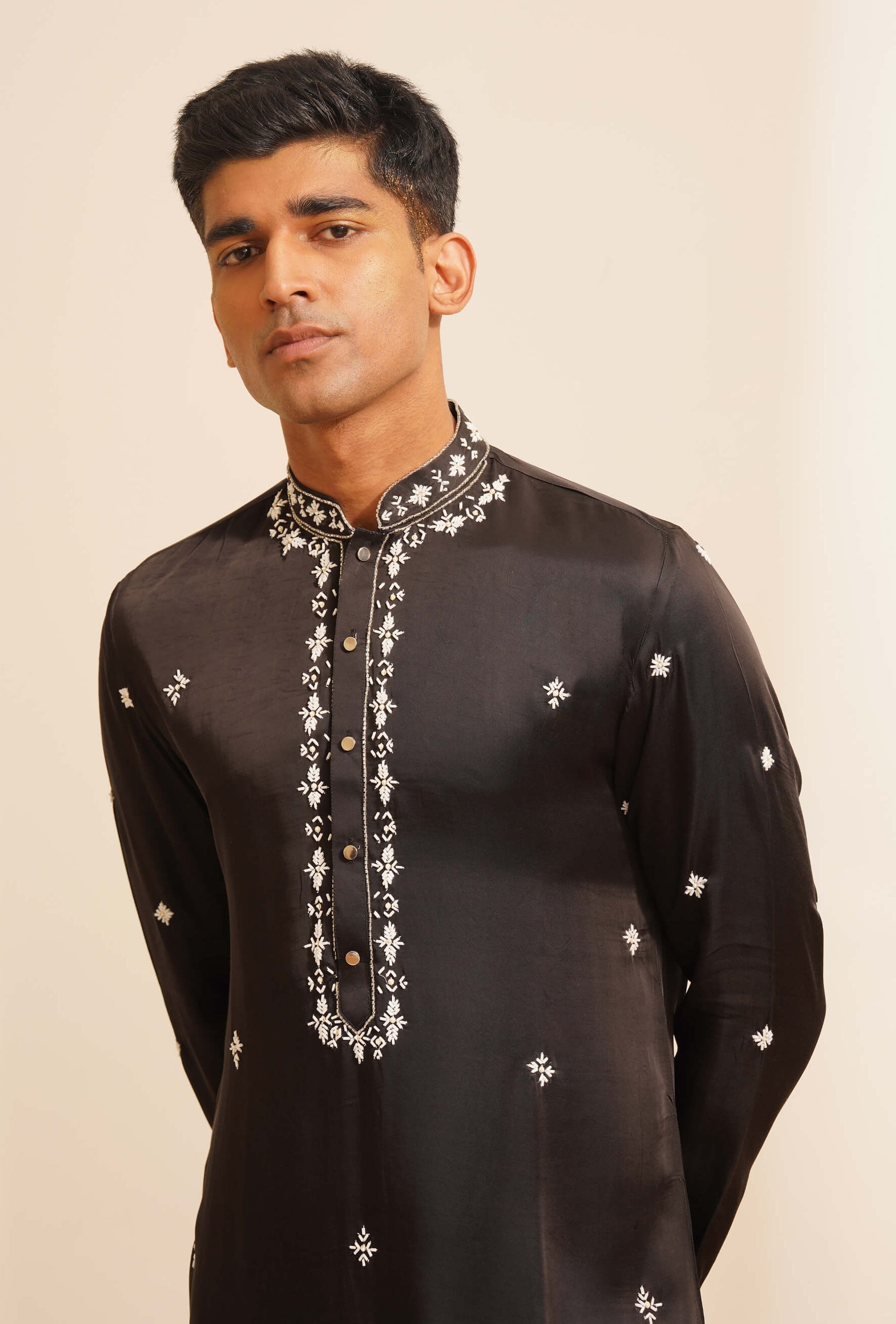 Introducing our sleek black waistcoat, featuring a refined mandarin collar and a discreet hidden placket for a clean, modern look. Adorned with exquisite hand embroidery, this waistcoat blends traditional artistry with contemporary sophistication. Perfect for adding a touch of elegance and detail to any outfit, it offers a versatile and stylish choice for both formal and special occasions.