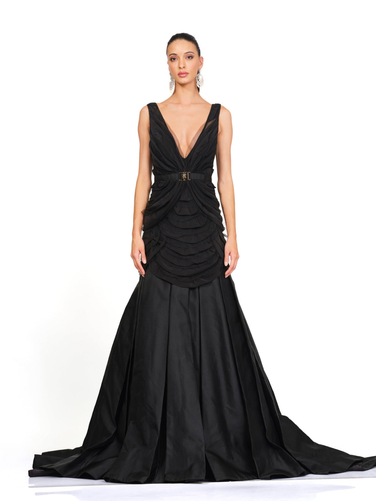 This stunning dress features a daring plunging neckline and a dramatic floor-sweeping trail, creating a captivating and elegant silhouette. The signature belt adds a distinctive touch, while the net ruffles on the hips enhance its sophisticated charm. Finished with a center back zipper closure, this dress combines bold design elements with refined details, making it perfect for making a memorable entrance at any special event.